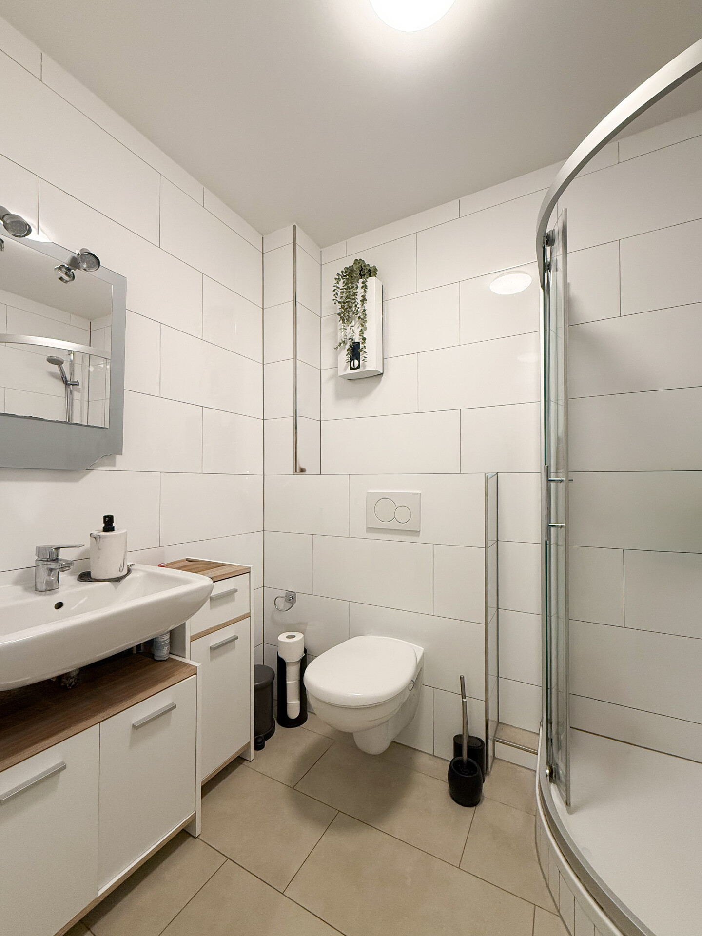 Im Wohnzimmer wurde hochwertiges Eichenparkett verlegt, während in den übrigen Räumen zeitlose Fliesen verwendet wurden. Ergänzend stehen ein Vorratsraum sowie eine Waschküche auf derselben Etage zur Verfügung.