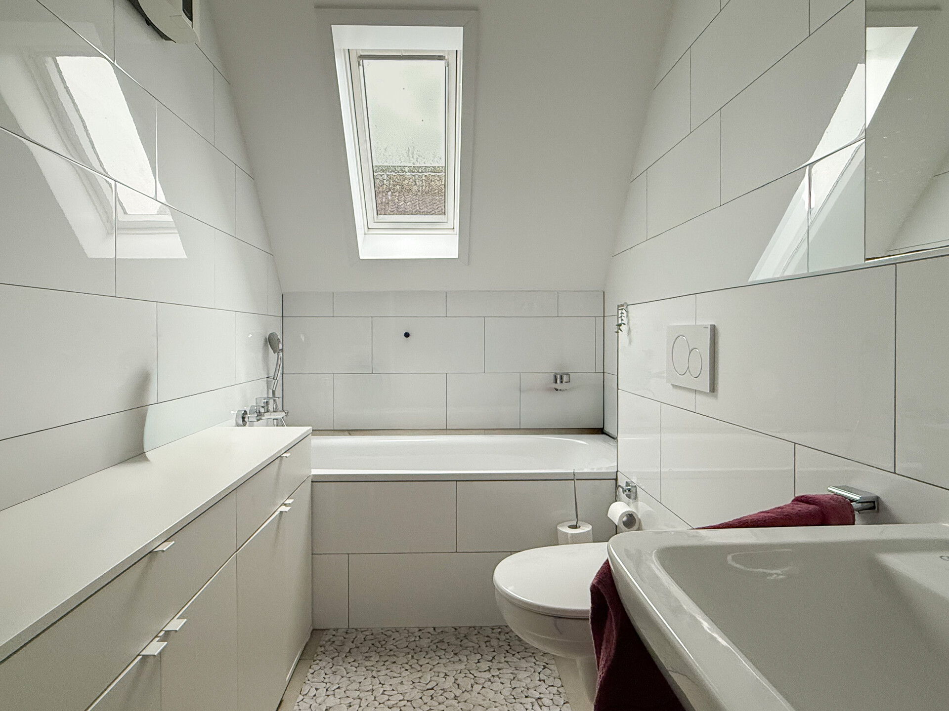 Das moderne Badezimmer ist mit Dusche, Waschbecken und WC ausgestattet. Ein zweites Bad verfügt über Tageslichtfenster, eine Badewanne, WC und Waschbecken.
