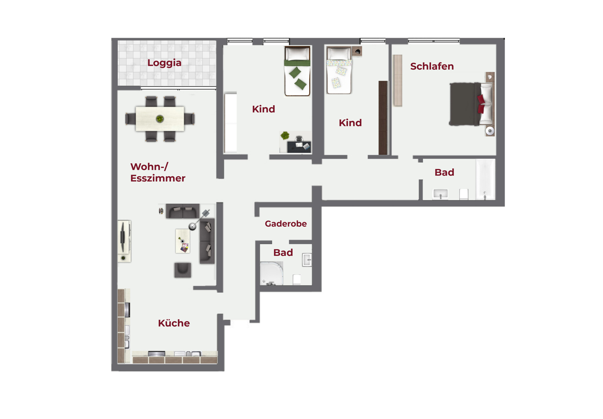 Über die einladende Diele mit ausreichend Stauraum sind alle Räume bequem erreichbar. Drei gut geschnittene Schlafzimmer bieten vielseitige Nutzungsmöglichkeiten als Kinder-oder Arbeitszimmer. Das großzügige Wohnzimmer bildet den Mittelpunkt der Wohnung und verbindet Wohn- und Essbereich.