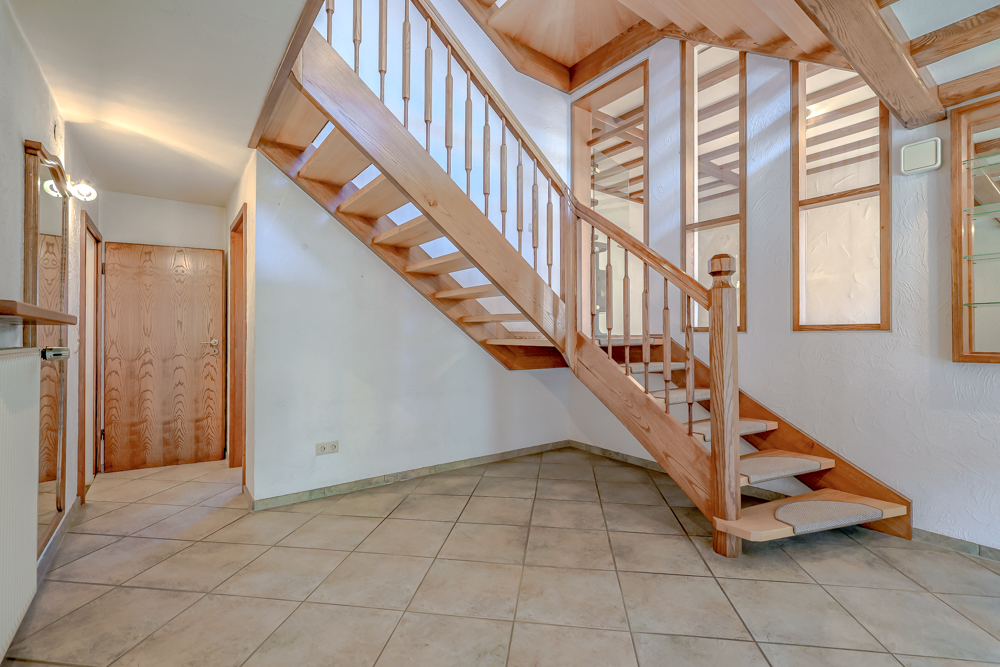 Das Highlight: Das maßgefertigte Treppenhaus, das sich eindrucksvoll vom Erdgeschoss bis unter die Dachspitze zieht. Besonders zur Weihnachtszeit schafft es den perfekten Rahmen für einen festlich geschmückten Baum – ein einzigartiges Ambiente, das Sie begeistern wird.