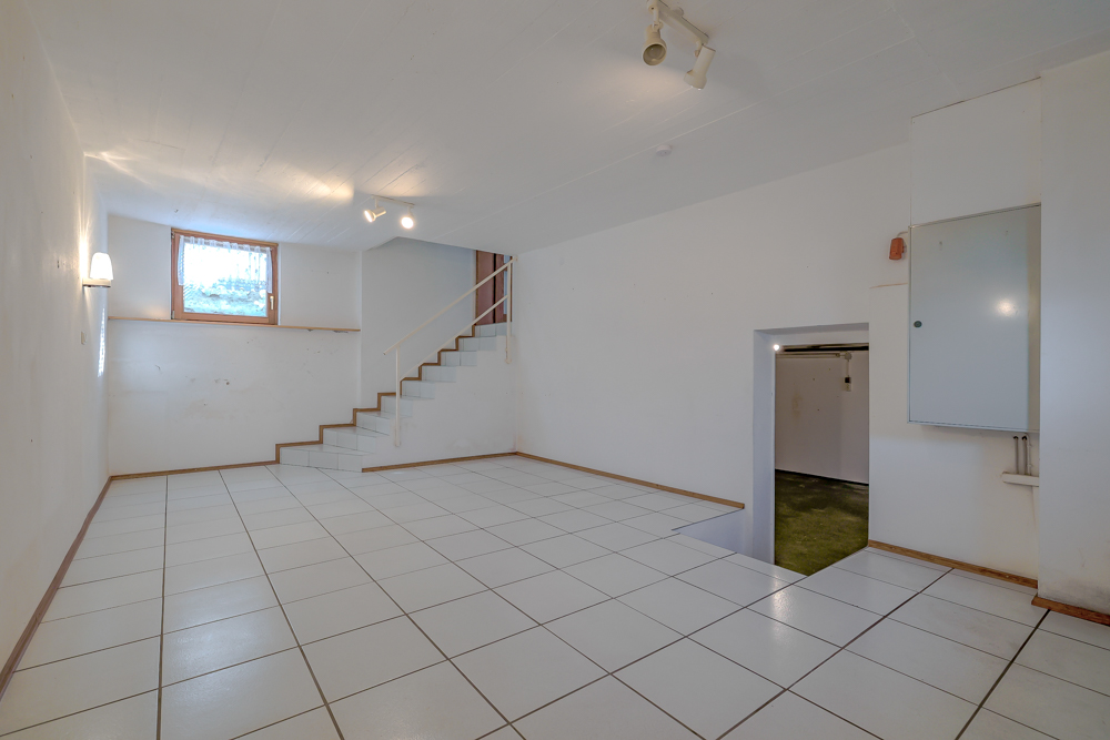 • Kellergeschoss: Über zwei Treppen vom Erdgeschoss erreichbar. Hier befinden sich ein großer, gefliester und beheizter Hobbyraum, ein großzügiger Vorratsraum, der Heizungskeller (Ölheizung, Baujahr 1996) sowie der Öltankraum. -