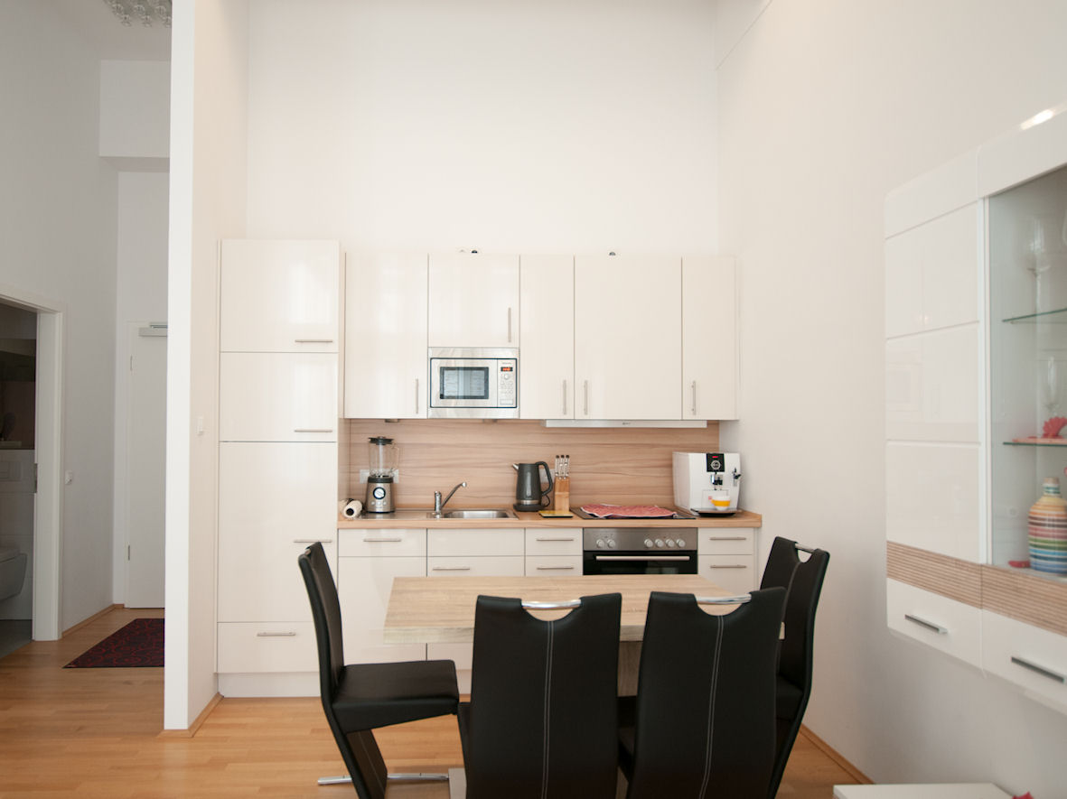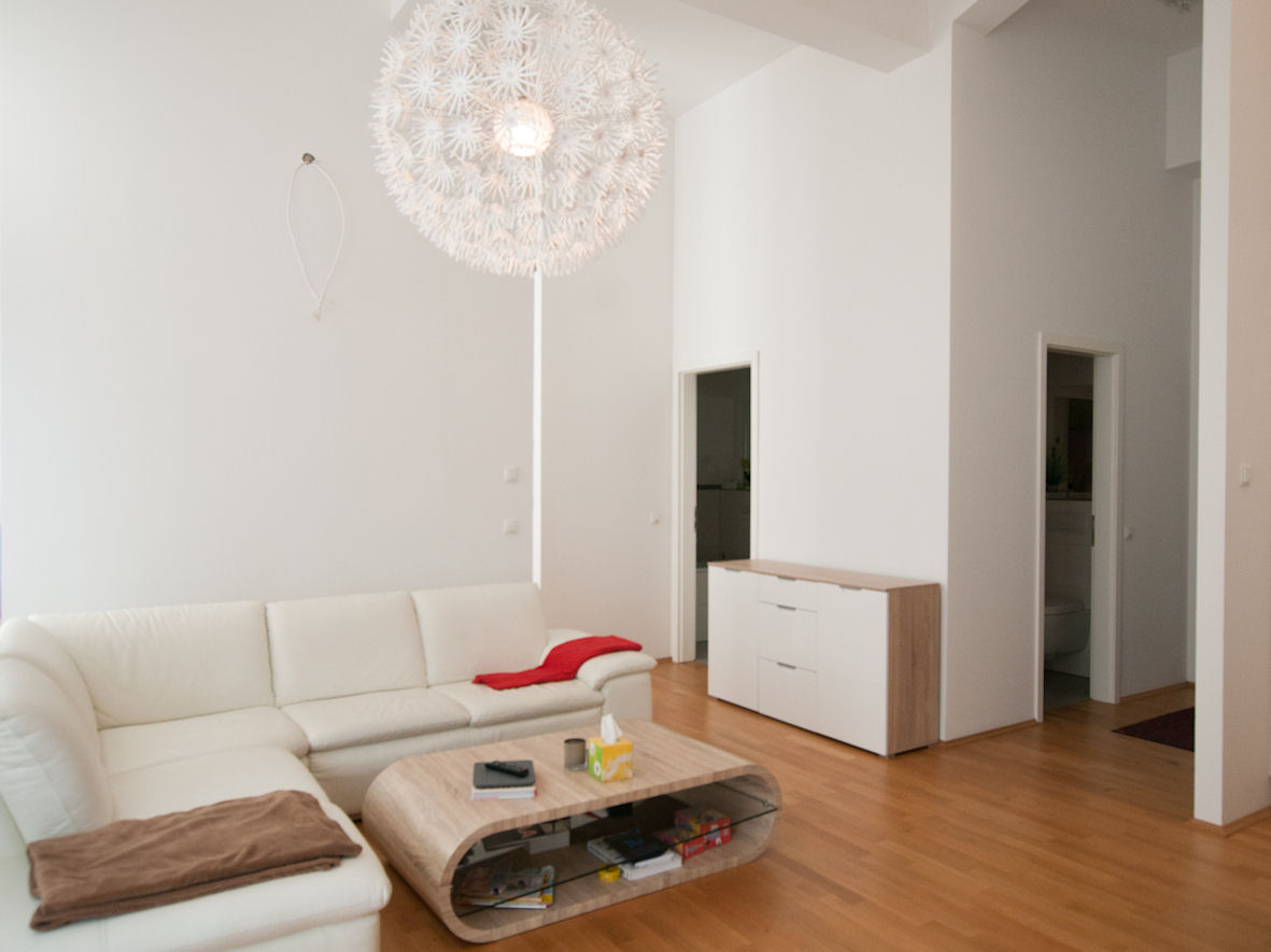 Die hohen Decken, eine große Glasfront zum Balkon und Parkettböden mit Fußbodenheizung belegen eine insgesamt gehobene Ausstattung und schaffen eine angenehme Wohnatmosphäre.