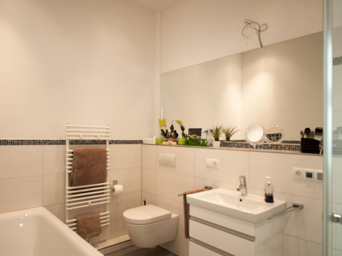 Die Wohnung ist per Aufzug erreichbar. Mit ihren ca. 70 m² bietet sie einen großzügigen Wohn- und Essbereich, mit integrierter Einbauküche und einem Zugang zu einer großen Terrasse. Ein modernes Bad mit bodengleicher Dusche plus einer bequemen Wanne, zusätzlicher Elektro-Handtuchheizung , ein separates Gäste- WC, sowie ein Hauswirtschaftsraum vervollständigen die Wohnung.