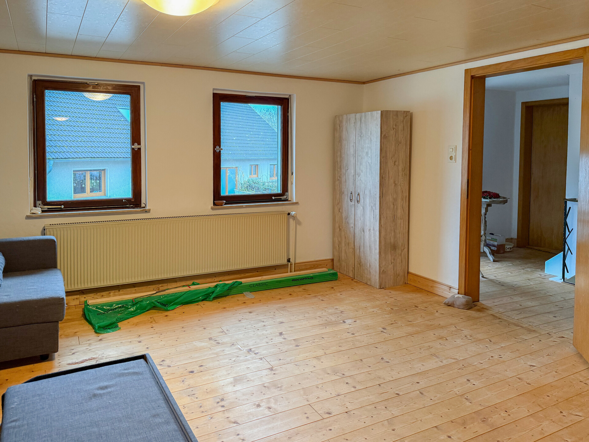 Der Wohnbereich erstreckt sich über 2 Etagen. Im Erdgeschoss befinden sich die Küche sowie ein geräumiger Wohn-/Essbereich, die zurzeit vom Eigentümer neu gestaltet werden. Ergänzt wird diese Etage durch einen Vorratsraum, ein großes Bad sowie ein Zimmer, welches sich ideal als Büro eignet. Das Obergeschoss wurde bereits umfangreich renoviert. So wurden z.B. ein neuer Dielenboden verlegt und die Wände mit einem Kalkputz versehen. Im Obergeschoss befinden sich insgesamt 5 Zimmer und ein Balkon mit Südausrichtung. Der Dachboden ist über eine Treppe erreichbar und noch ausbaufähig.