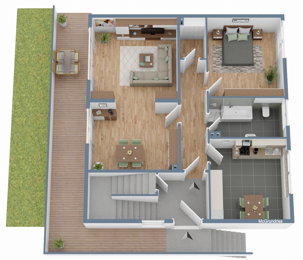 Über das zentrale Treppenhaus sind der Keller sowie beide Wohneinheiten erreichbar.