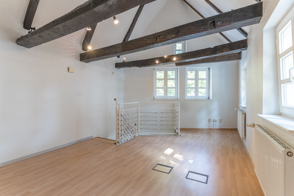 Eine interne Treppe führt ins Obergeschoss, das mit zwei weiteren Räumen aufwartet. Besonders hervorzuheben ist der vordere Raum: Hier sorgen freiliegende Dachbalken und eine bis in den First offene Decke für ein großzügiges Raumgefühl und eine besondere Ausstrahlung. Klassische Sprossenfenster in beiden Etagen unterstreichen den historischen Charakter und sorgen zudem für ausreichend Tageslicht.