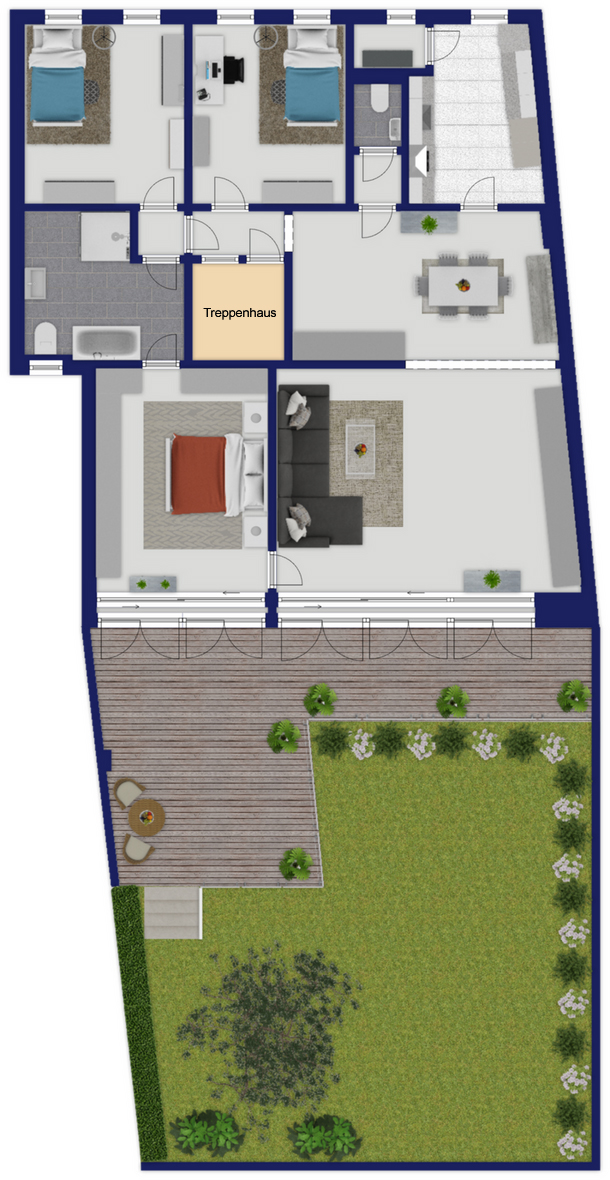 Insgesamt bietet diese Wohnung eine gelungene Kombination aus großzügigem Wohnen, funktionaler Raumaufteilung und attraktiven Außenflächen. -