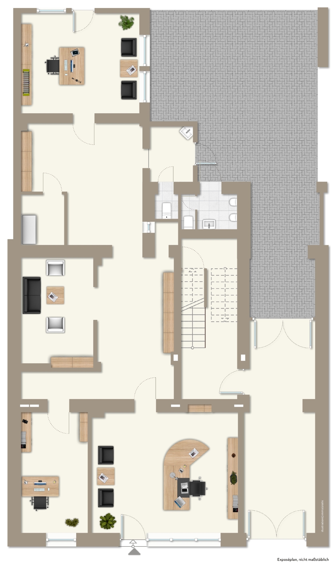 Die Gesamtgewerbefläche kann modular in bis zu vier Büroeinheiten getrennt werden und ermöglicht eine flexible Nutzung entsprechend individueller Raum- und Organisationsbedürfnisse mit separater elektrischer Unterverteilung. Es stehen weitere 3 WCs und 3 Teeküchen im Hinterhausbereich zur Verfügung. Angrenzend befindet sich eine Lagerhalle, die über die Toreinfahrt in nur wenigen Schritten von der Straße direkt zugänglich ist. Die Gesamtfläche ist wahlweise in Segmenten von 59m² bis 118m² teilbar!