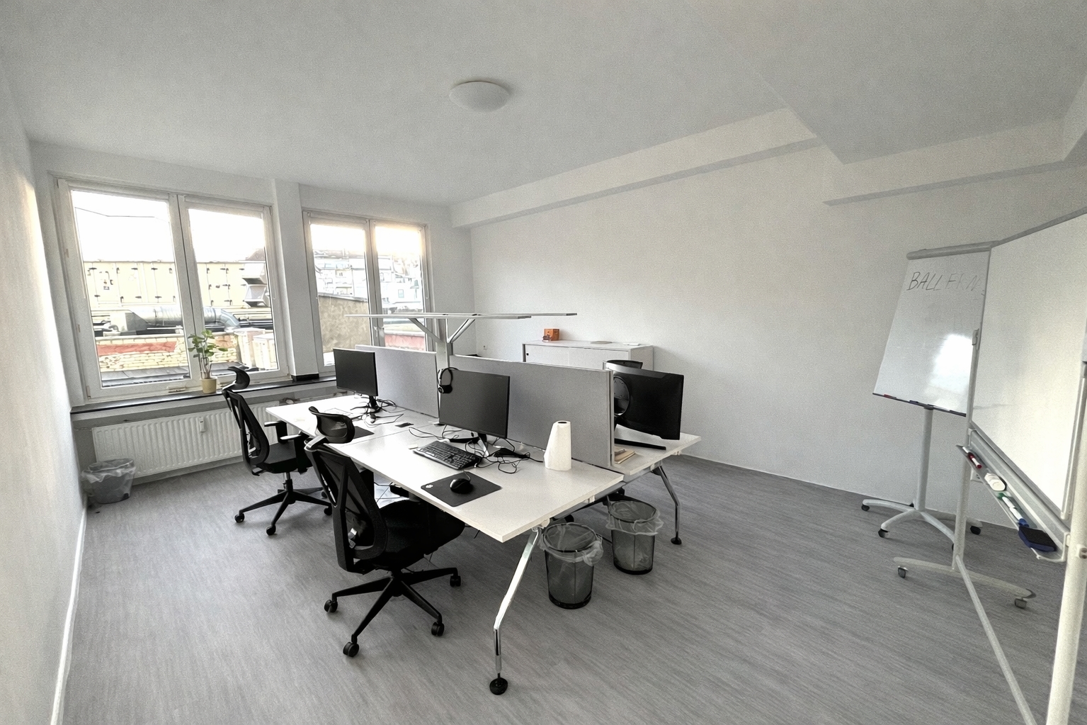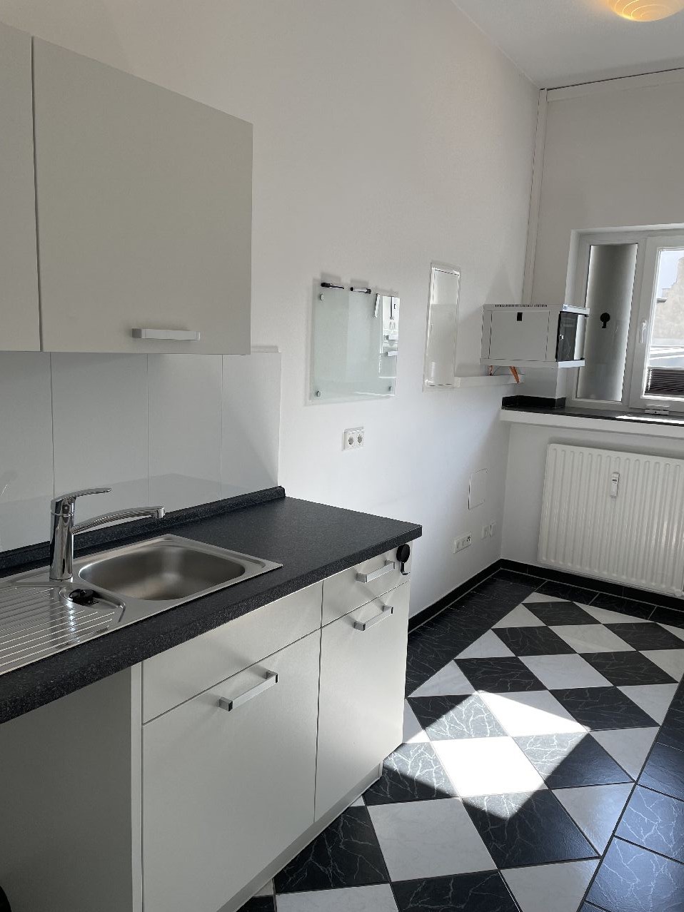 • Großflächige Fenster, weiß gestrichene Wände, gepflegter, ggf. in Abstimmung mit dem Eigentümer, neuer Bodenbelag (grauer Boden = KI-generiert, Schachbrettmuster aktuell). Fernwärme sorgt für Nahwärme – und eine Klimaanlage für den kühlen Kopf. Dazu eine Teeküche (ohne Spülmaschine). Eigentlich ist schon alles bereitet!