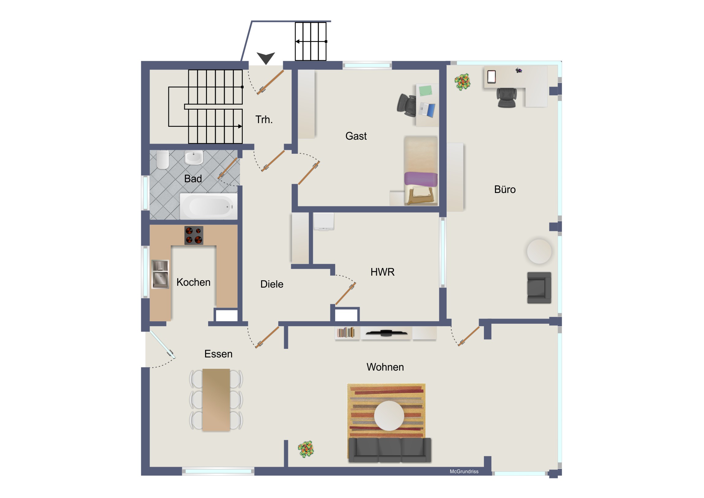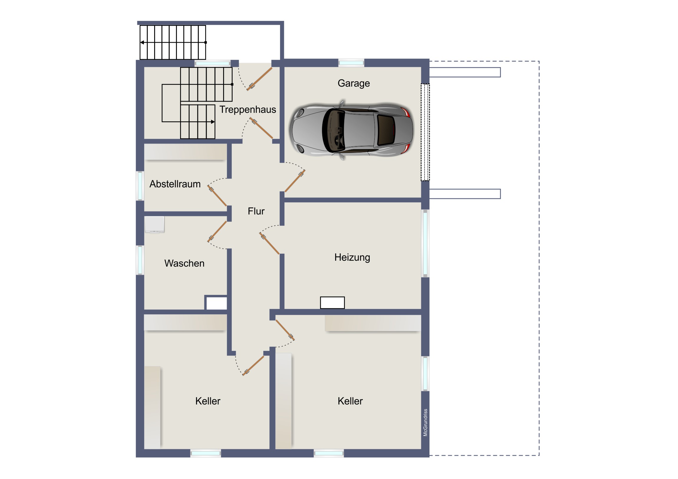 • Erdgeschoss: 4 Zimmer, Küche, Diele, Bad/WC und Wintergarten. Obergeschoss: 4 Zimmer, Küche, Diele, Bad/WC und Wintergarten. Spitzboden ausbaufähig. Voll unterkellert. Garage.