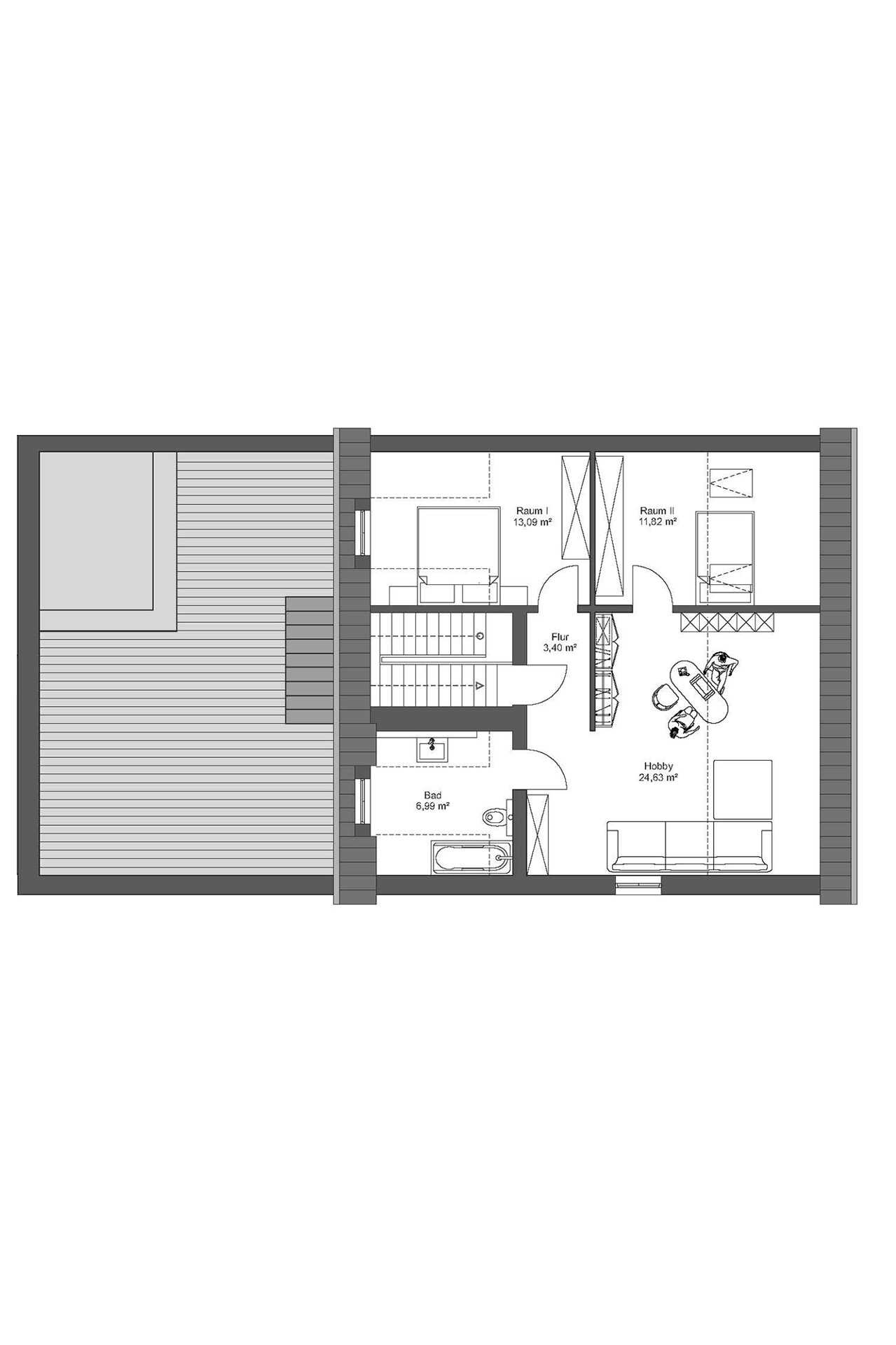 Das Dachgeschoss ist ideal für Kinder, Gäste oder kreative Nutzungsideen: Zwei helle Zimmer, ein offener Hobby- und Wohnbereich sowie ein großzügiges Tageslichtbad mit Badewanne bieten Rückzugs- und Entfaltungsmöglichkeiten.