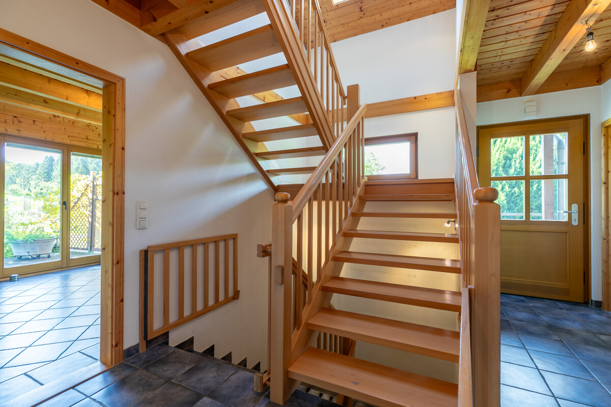 Von den hervorragend dämmenden Holzwänden dieses Stommel-Hauses und der klimatisierenden Wirkung, die gefühlte Temperatur 2 – 3 Grad angenehmer als die gemessene erscheinen zu lassen, profitieren die Bewohner das ganze Jahr über. Und im Winter muss die Heizung nur sparsam zum Einsatz kommen, da hier ein Kaminofen für Wärme und Behaglichkeit sorgt.