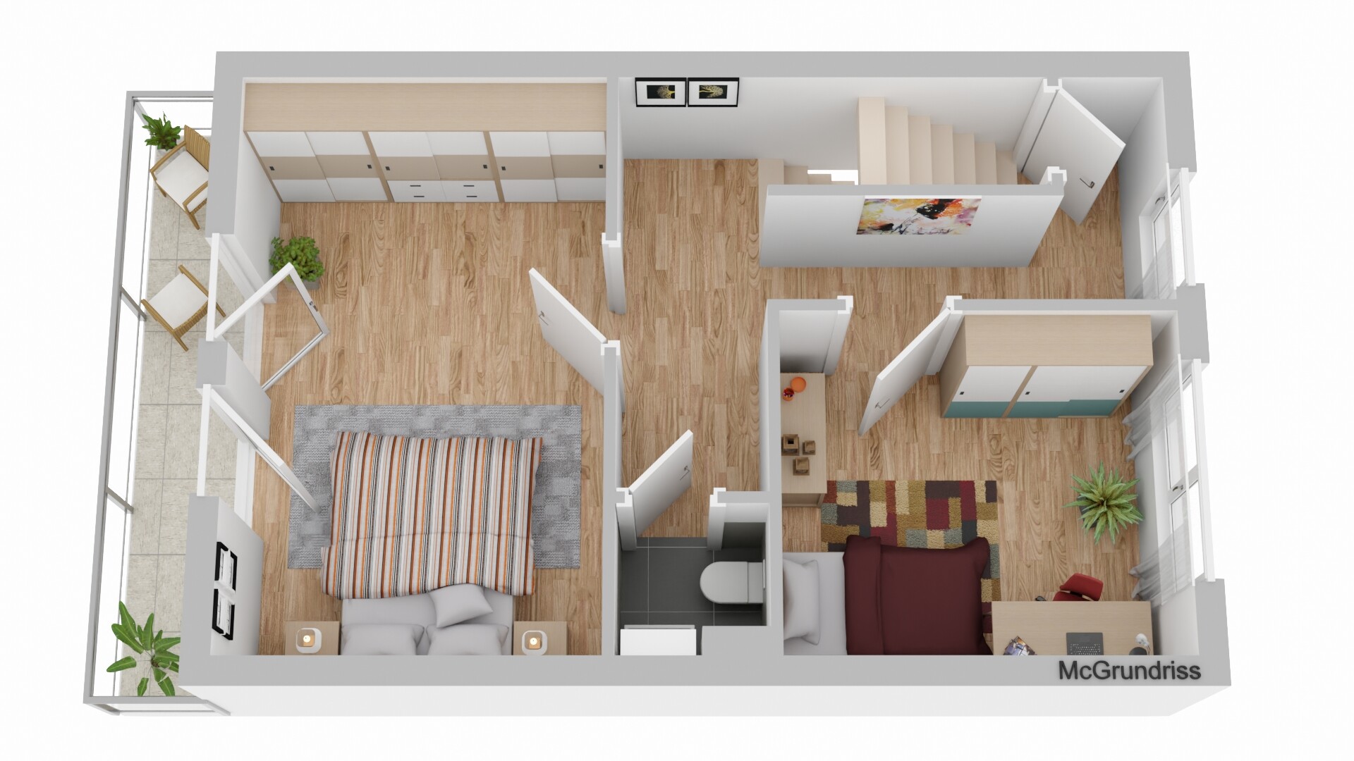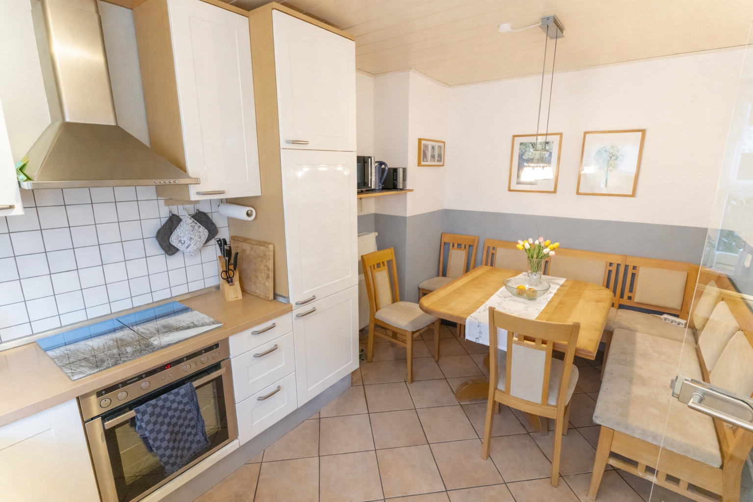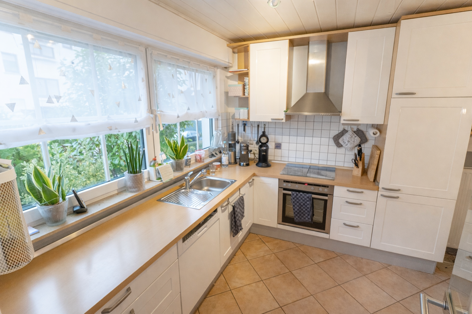 Das Erdgeschoss bildet den zentralen Lebensmittelpunkt des Hauses. Hier befinden sich die Küche mit integriertem Essbereich sowie das Wohnzimmer mit direktem Zugang zur Terrasse und fließendem Übergang in den rückseitigen Garten. Der Garten, die Terrasse sowie der Balkon im Obergeschoss sind ideal nach Südosten ausgerichtet.