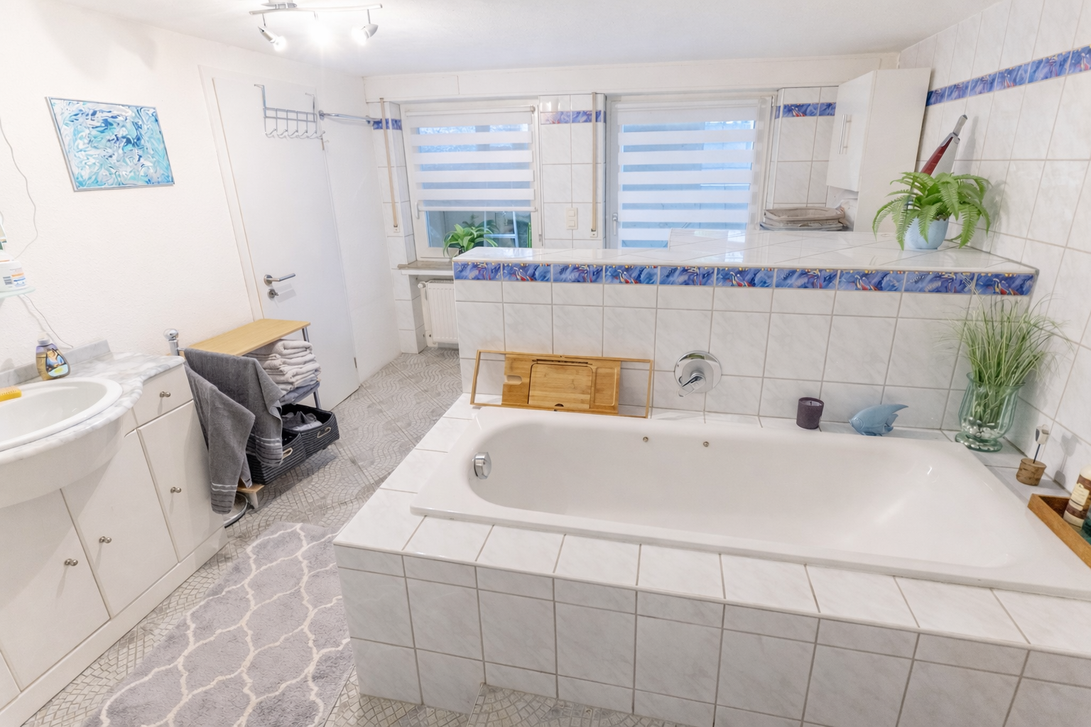 Badezimmer: Tageslichtbad mit Dusche und Badewanne im KG