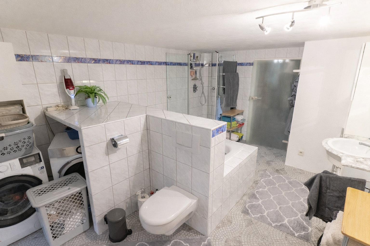 Das teilweise wohnlich ausgebaute Kellergeschoss erweitert die Nutzungsmöglichkeiten. Neben dem Heizungsraum und einem Abstellraum befinden sich hier ein Tageslichtbad mit Badewanne und Dusche sowie ein Raum, der derzeit als Arbeitszimmer genutzt wird. Vom Kellergeschoss besteht zudem ein direkter Zugang in den Garten.