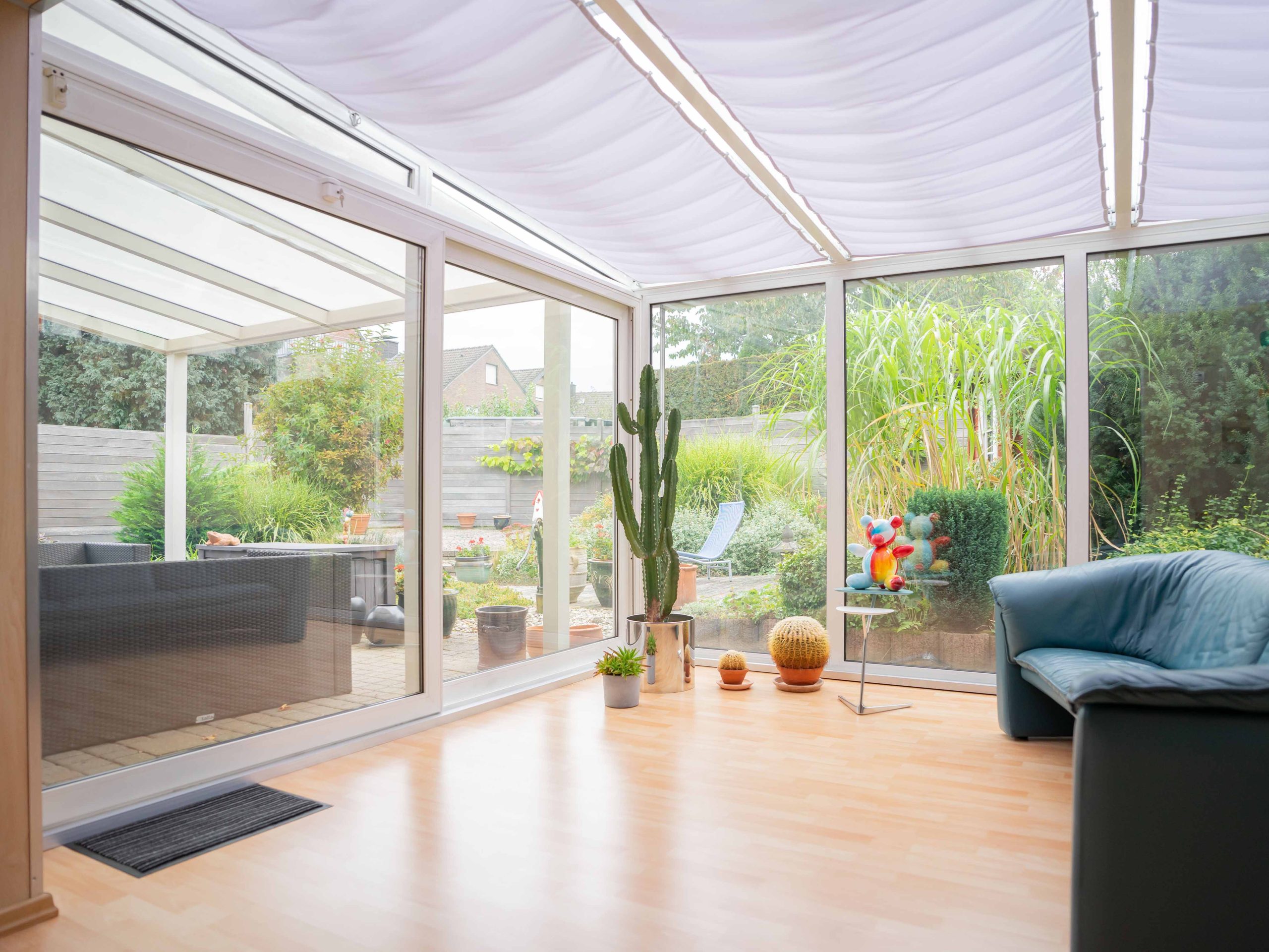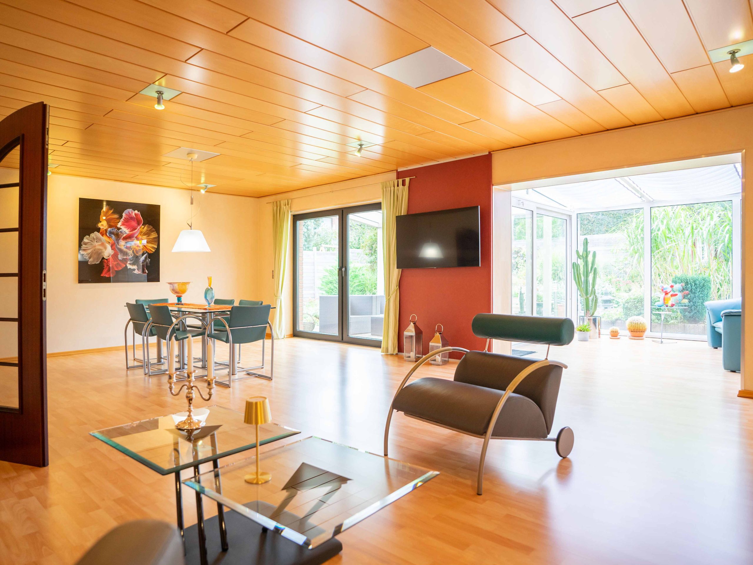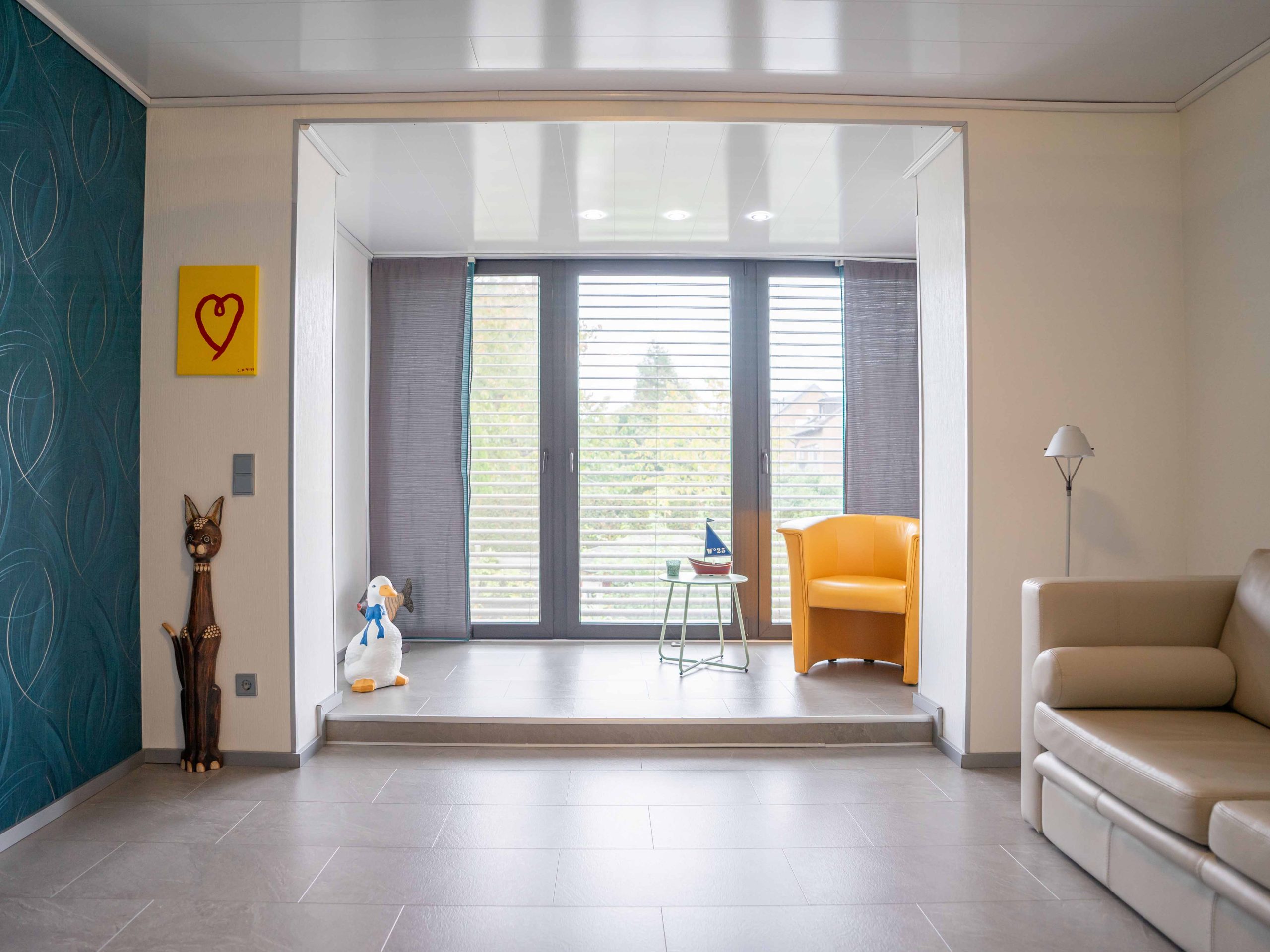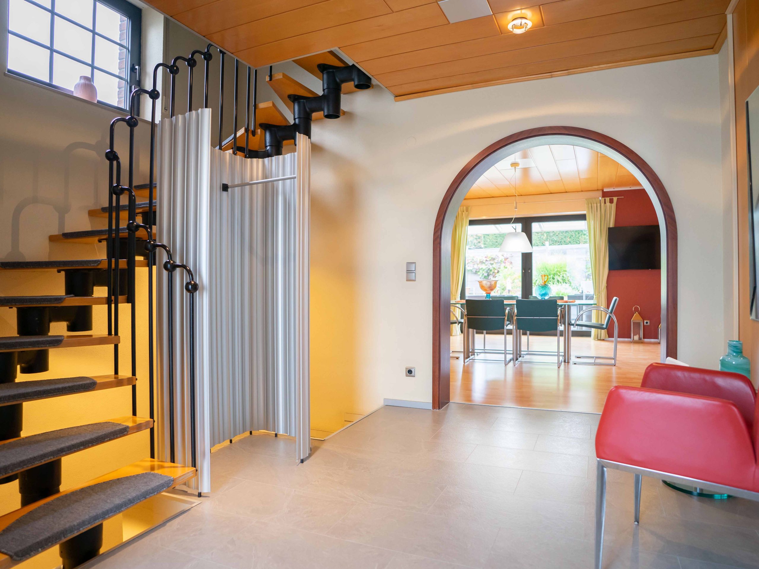 Sie betreten das Haus und gelangen zunächst in den einladenden Dielenbereich. Hier befindet sich zu Ihrer linken Seite das Gäste-WC mit Fenster. Rechts gelegen ist die gemütliche Küche mit ausreichend Platz für einen Esstisch. Geradeaus erreichen Sie das großzügige Wohn-/ und Esszimmer mit Wintergarten. Von hier aus gelangen Sie in den pflegeleicht angelegten Garten mit insgesamt drei Terrassen. Die überdachte Außentreppe führt direkt in das Kellerbüro.