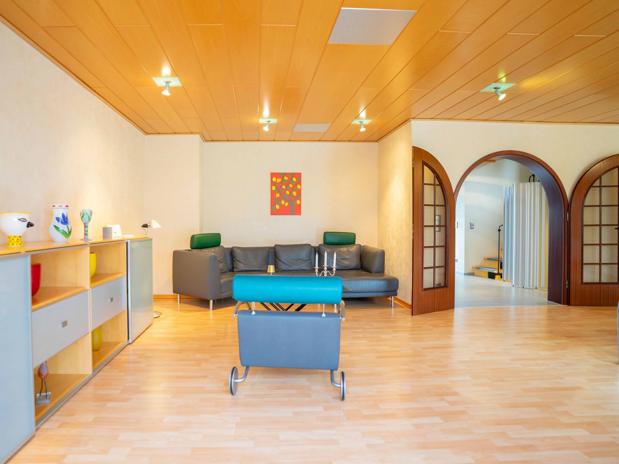 Im Keller befinden sich ein Büro, ein Raum mit Sauna, Dusche und Kellerbar, der Hausanschlussraum mit der Gas-Brennwert-Heizung/ Waschmaschinen- und Trockneranschlüssen sowie zwei weitere Räume mit Platz zum Lagern. Parken können Sie in der Garage und davor. Hinter der Garage gibt es noch einen praktischen Geräteraum.