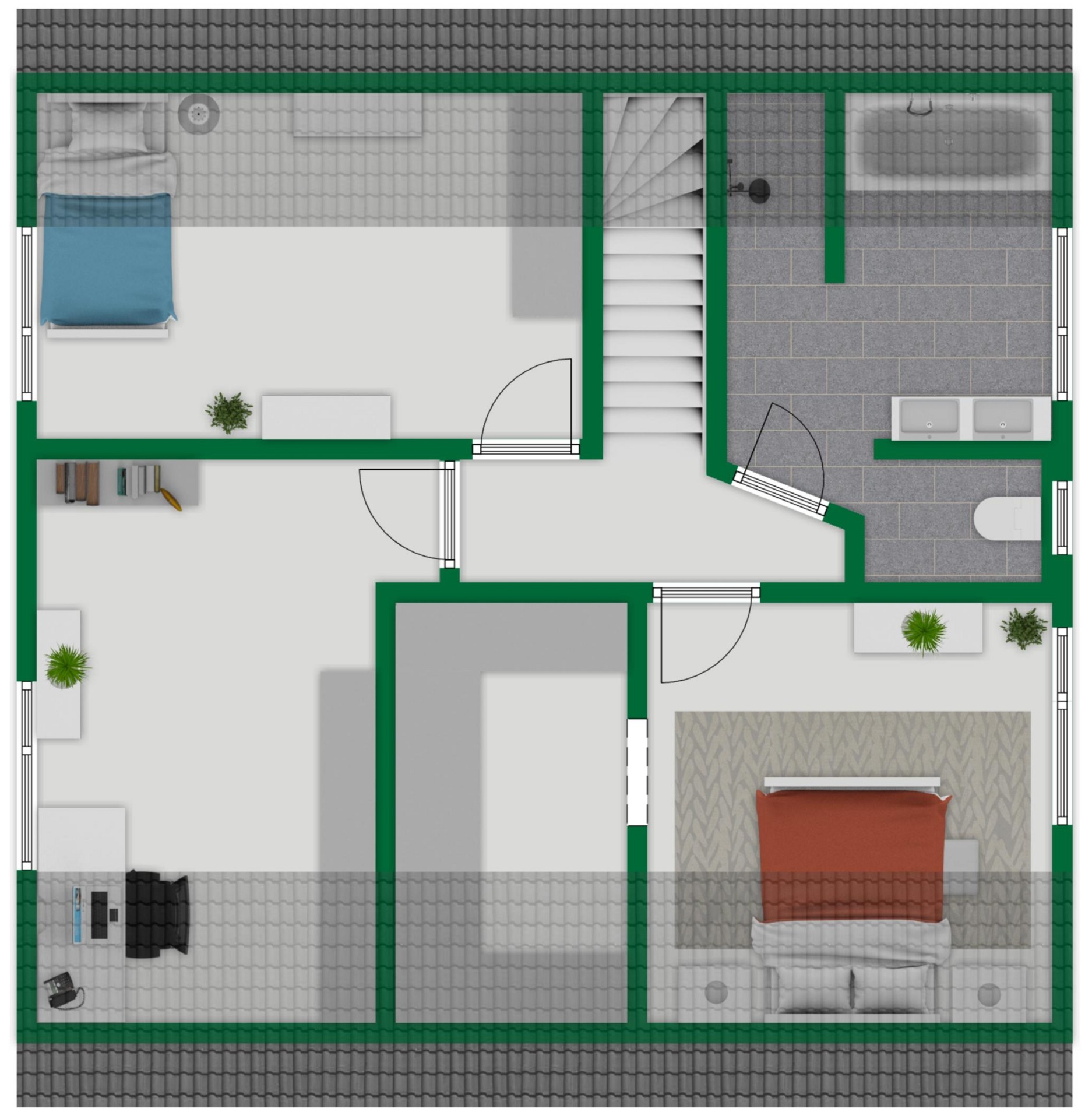 + Hoher Kniestock im Obergeschoss – kaum Einschränkungen durch Dachschrägen