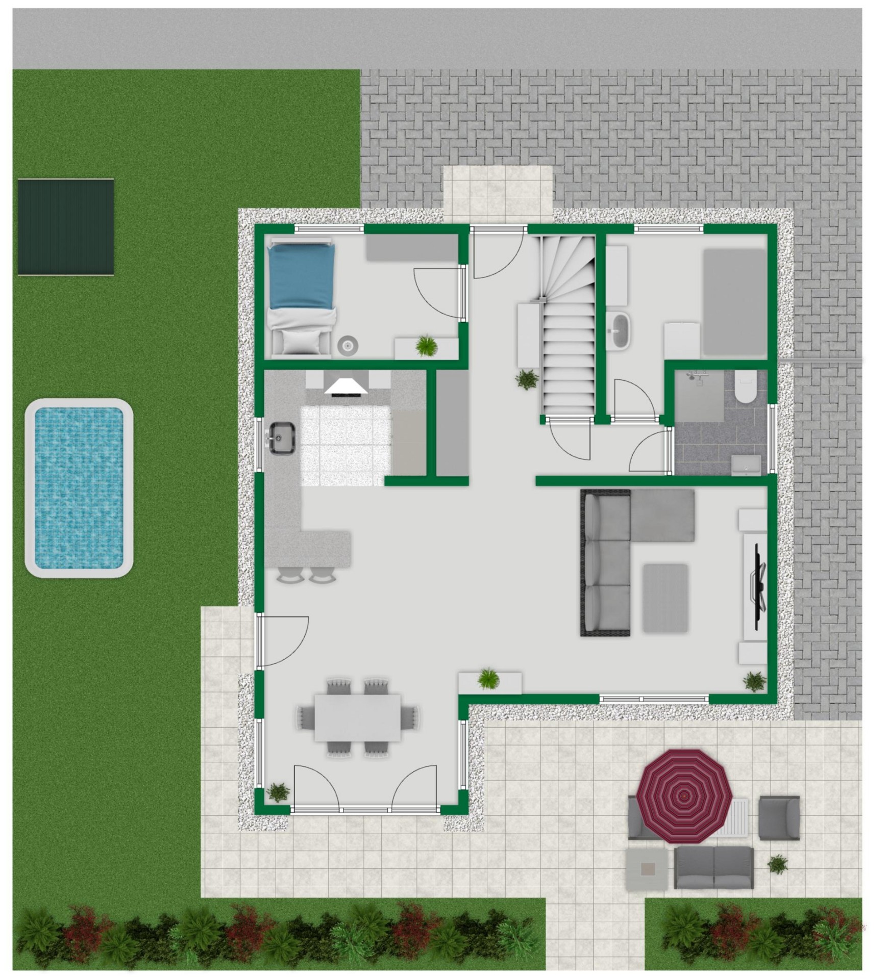 + Modernes Gartenhaus und aufwändig angelegter Garten