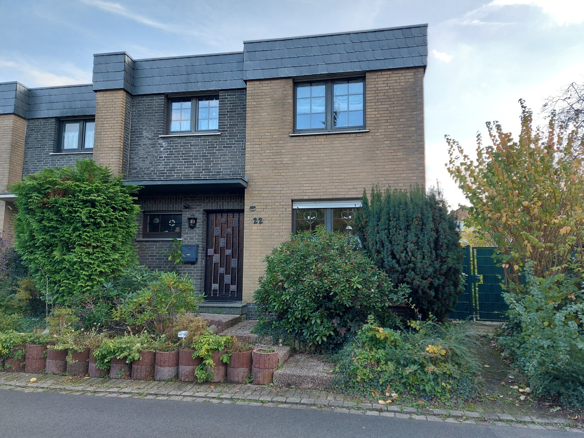 • – Massivbauweise mit gelber und grauer Klinkerfassade, Schiefer im oberen Fassadenbereich.