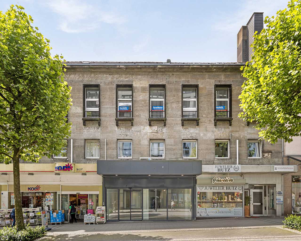 Zum Verkauf steht ein Geschäftshaus mit fünf Einheiten in Premium-Lage von Remscheid. Das in den 1950er Jahren in Massivbauweise auf einem 793 m² großen Grundstück errichtete Ensemble ist vollunterkellert und beinhaltet aktuell drei Ladenlokale im Erdgeschoss. Diese sind an einen 24-Stunden E-Kiosk und einen Juwelier vermietet. Eine Fläche ist gerade frei gezogen worden und befindet sich in der Neuvermietung. Im 1. Obergeschoss befindet sich eine Zahnarztpraxis, im 2. Obergeschoss ein Lern- und Fortbildungsstudio.