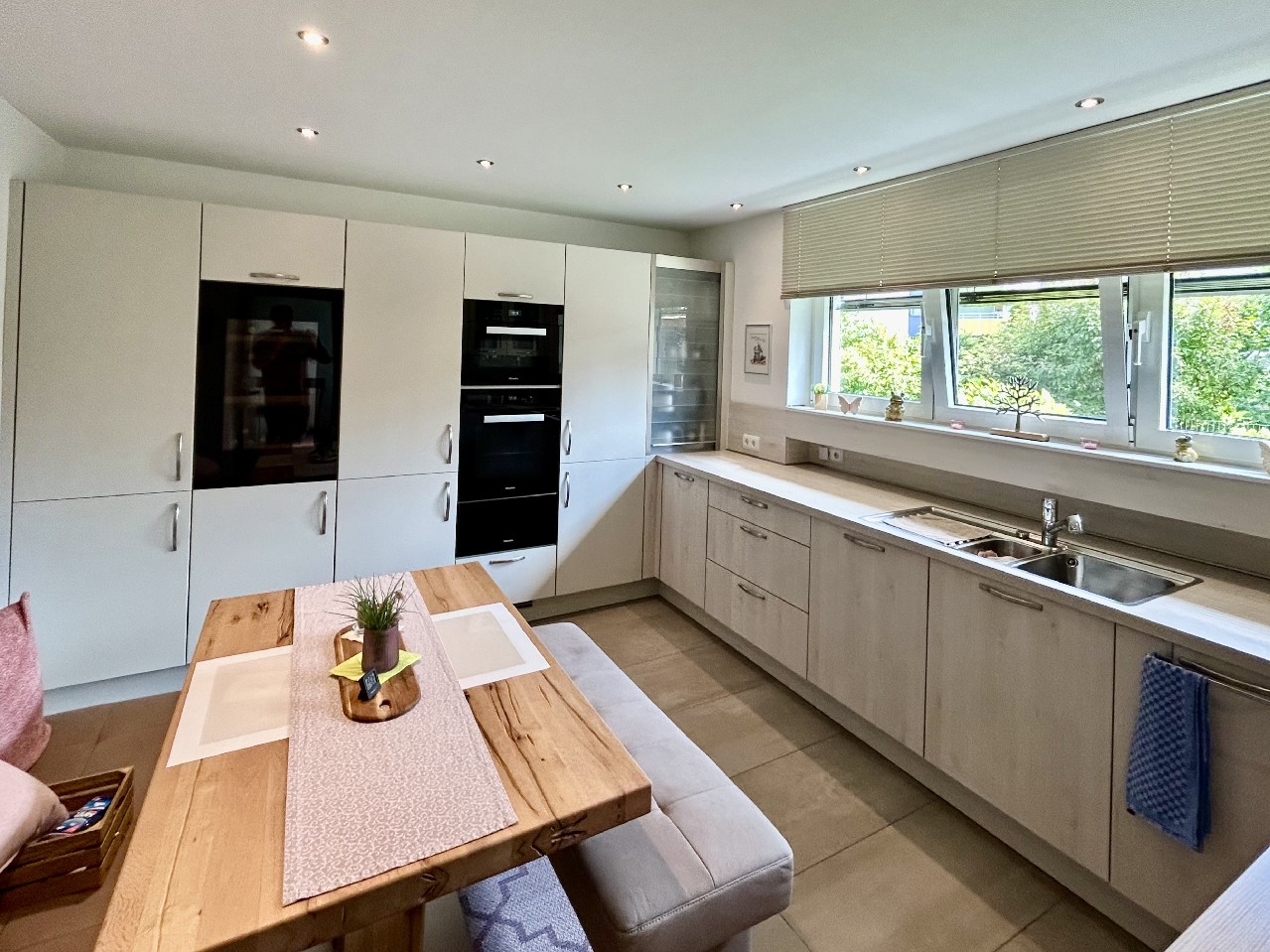 Alle Fenster wurden durch moderne, einbruchsichere Aluminiumfenster mit Kunststoffbeschichtung, Dämmverglasung und Einbruchsicherungen ersetzt. Ergänzt wird der Komfort durch zeit- und lichtgesteuerte Horizontallamellen sowie integrierte Insektenschutzsysteme – je nach Raum unterschiedlich und stets funktional durchdacht.