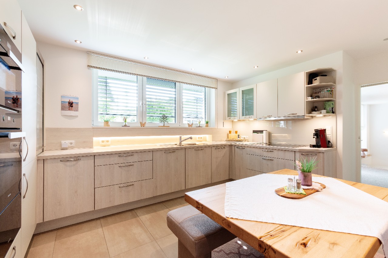 Der Sanitärbereich erfüllt höchste Ansprüche an Funktionalität und Komfort: Ein Gäste-WC im Eingangsbereich, ein barrierefreies Duschbad en Suite zum Schlafbereich sowie ein weiteres, nahezu baugleiches barrierearmes Duschbad im Gartengeschoss – ideal auch für einen potenziellen Einliegerbereich. Die Bäder sind zusätzlich zur Zentralheizung mit elektrischer Fußbodenheizung ausgestattet und wurden im Zuge einer Kernsanierung 2018 modernisiert.