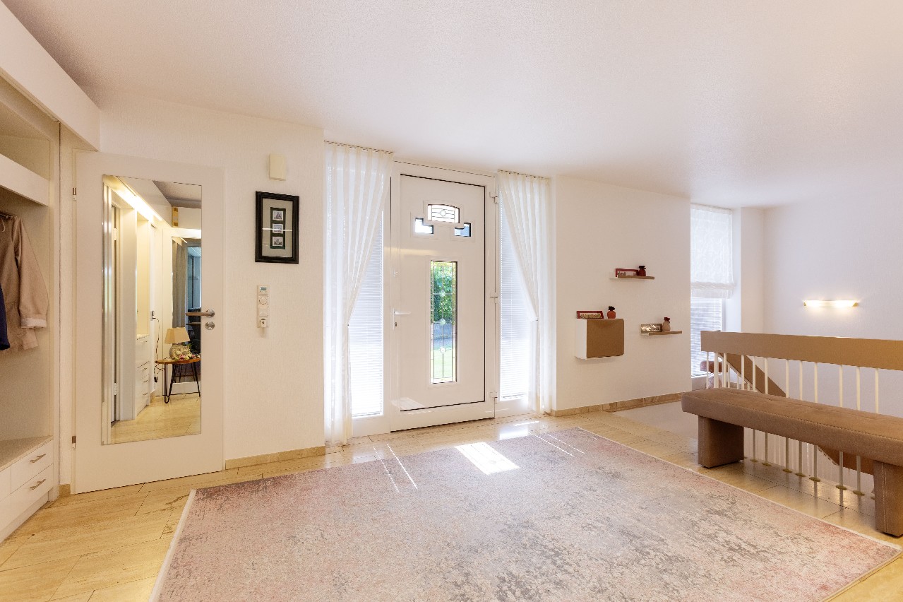 Das Entrée und der Wohnbereich werden von edlem, original italienischem Marmor geprägt, der eine stilvolle Atmosphäre schafft. In den weiteren Räumen wurden hochwertige Landhausdielen, Feinsteinzeug und Designpaneele verlegt, die den eleganten Stil des Hauses konsequent fortführen.