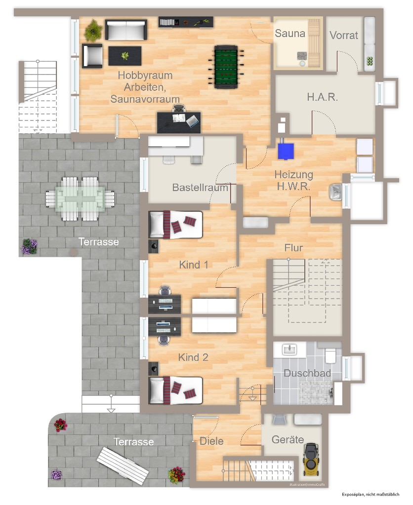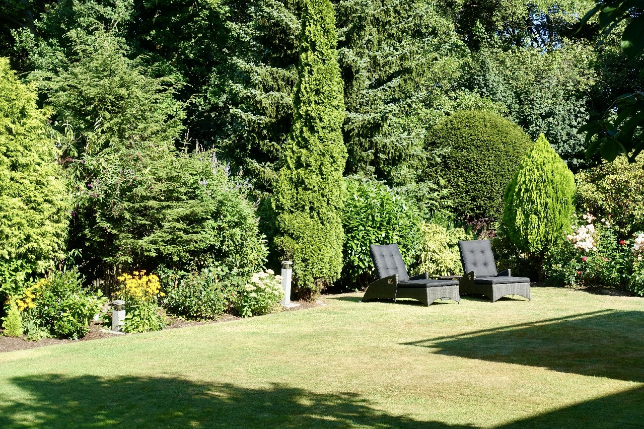 Der liebevoll angelegte Vorgarten und der großzügige Gartenbereich mit zwei Terrassen hinter dem Haus bieten viel Platz zur Entspannung und Freizeitgestaltung. Ein separates Gartengerätehaus ergänzt die Nutzfläche ideal. Eine Doppelgarage mit elektrisch betriebenen Sektionaltoren, Stromanschluss und Beleuchtung sowie weitere private Stellplätze auf dem separaten Garagengrundstück bieten ausreichend Parkmöglichkeiten für mehrere Fahrzeuge.
