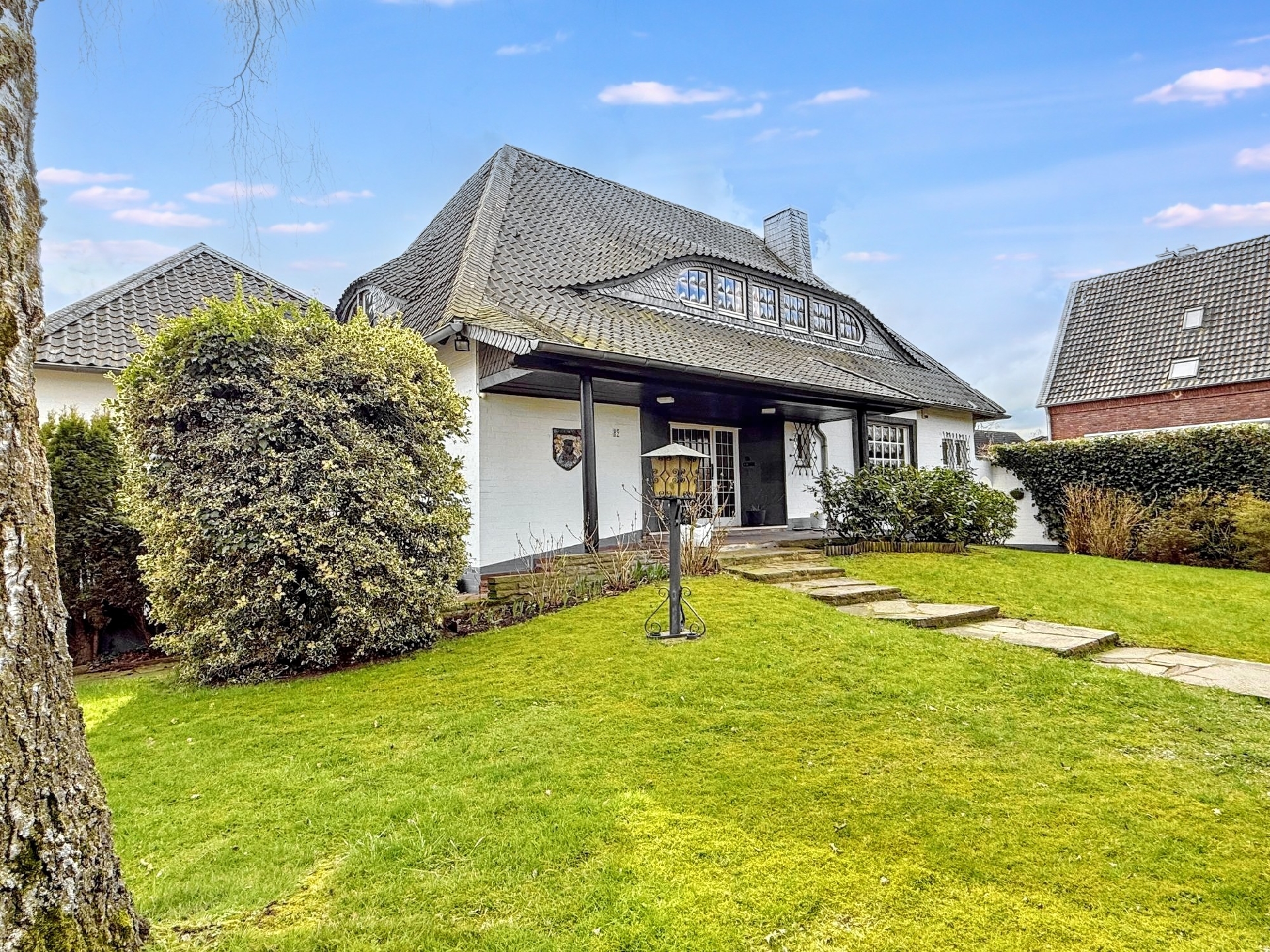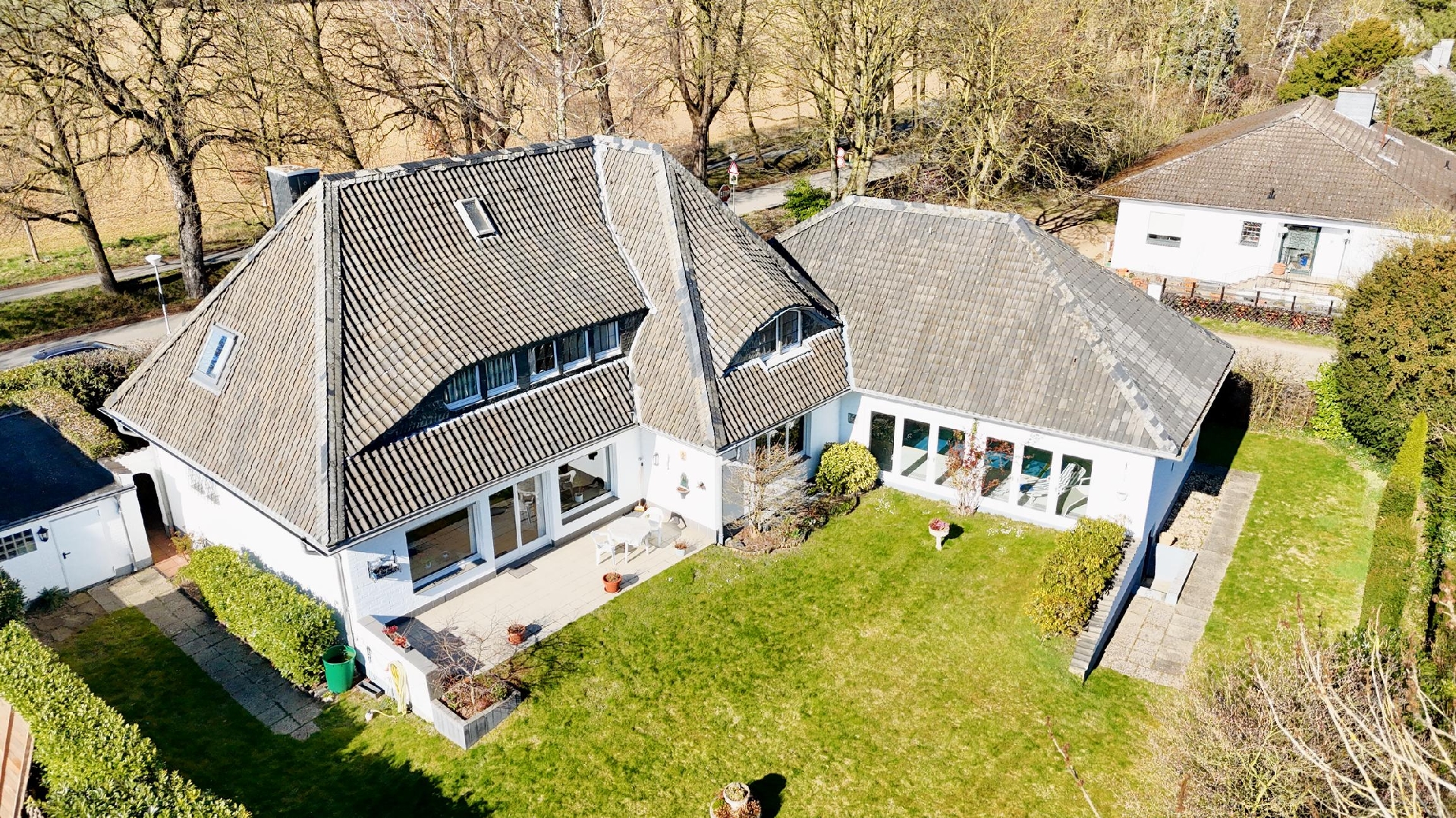 Durch die geschickte Platzierung des L-förmigen Gebäudes auf einer leichten Anhöhe, mittig des Grundstücks, entsteht eine elegante Grundstücksstruktur. Der großzügige Vorgarten mit altem Baumbestand, charmantem Eisentor und einer dichten Hecke bildet ein repräsentatives Entree. Zur Rechten des Wohnhauses befinden sich eine geräumige Doppelgarage mit Sektionaltor und zwei davorliegende PKW-Stellplätze. Ein weiteres Tor in der nordöstlichen Grundstückseinfriedung ermöglicht einen zusätzlichen Weg das Grundstück zu betreten oder zu befahren. Von hier aus ist auch die Garage im Kellergeschoss erreichbar. Der stets sehr gepflegte Garten ist südlich ausgerichtet und wenig einsehbar.