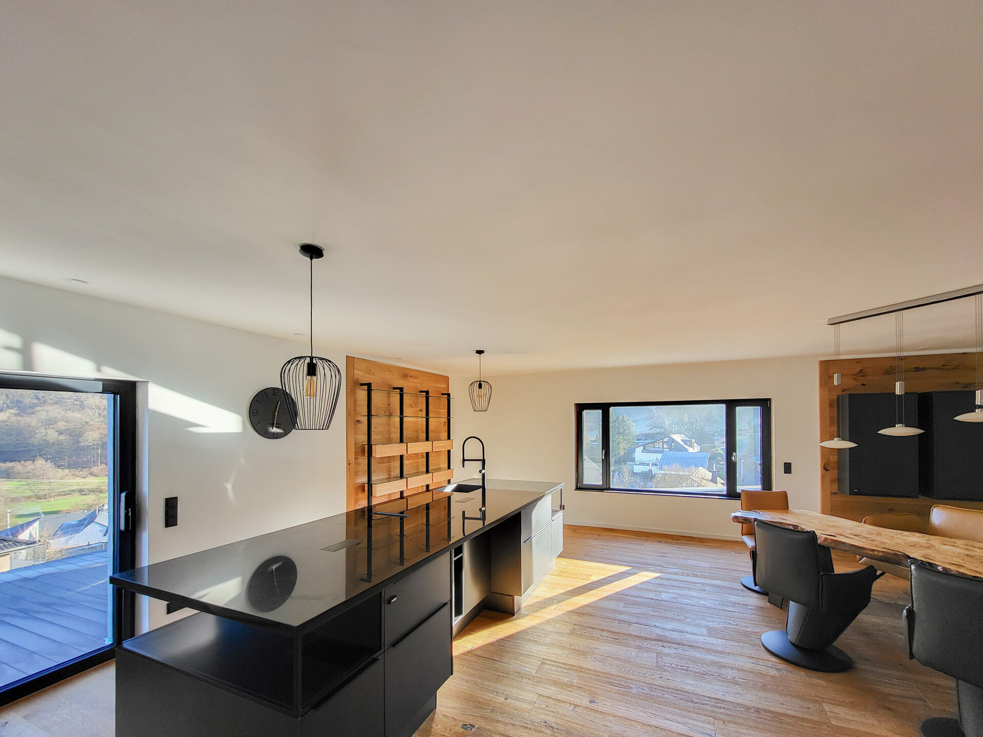 Über das offen gestaltete Treppenhaus gelangen Sie in das Obergeschoss. Hier erwartet Sie auf ca. 60 m² ein beeindruckender Koch-, Wohn- und Essbereich. Besonderes Highlight ist die große Kochinsel, die zum Kochen und Verweilen einlädt. Zusätzlich steht Ihnen ein separater Nebenraum zur Verfügung, der derzeit als zweite Küche genutzt wird und weitere Arbeits- sowie Abstellflächen für Küchengeräte bietet.