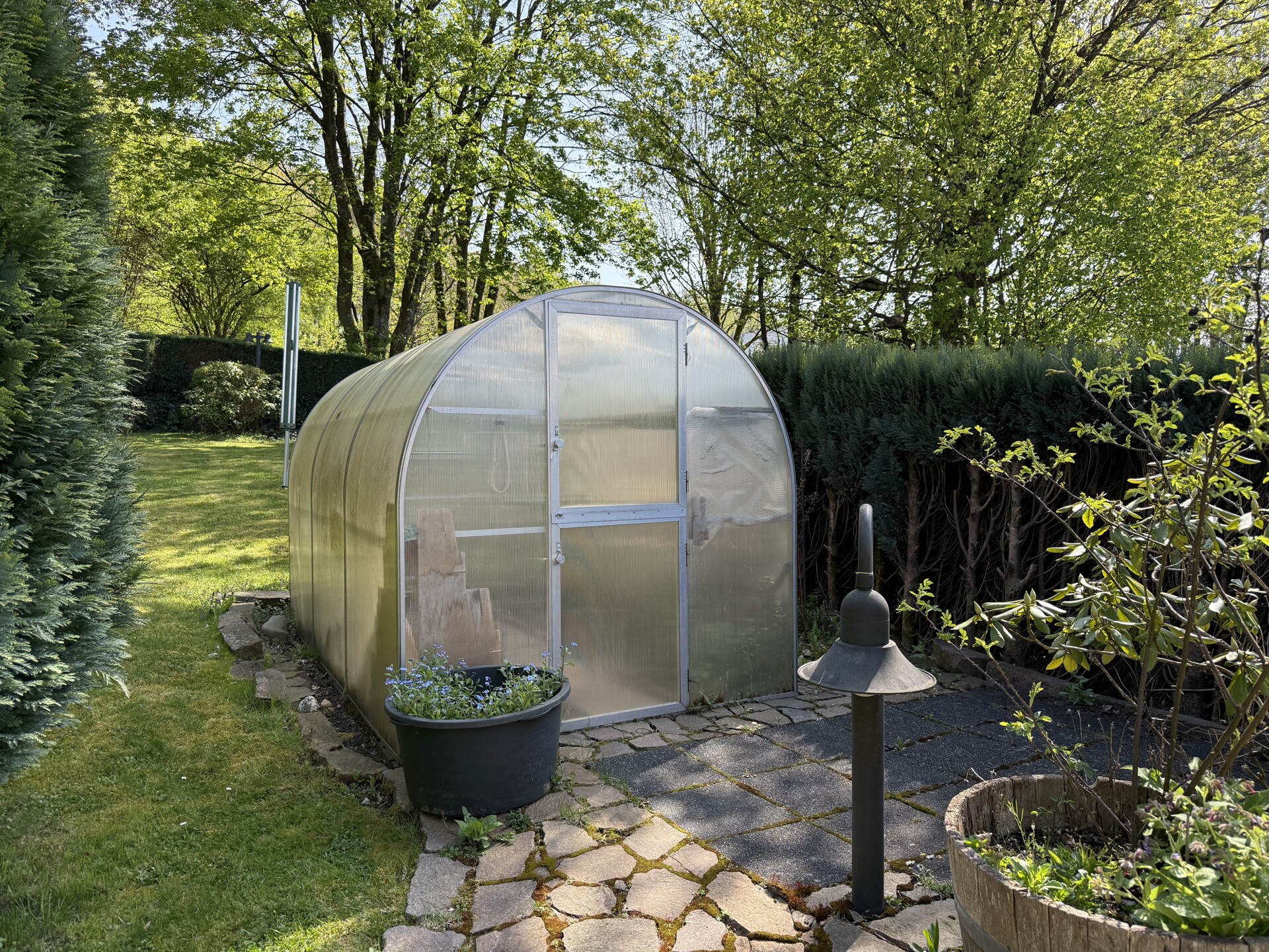 Dieses gepflegte Einfamilienhaus aus dem Jahr 1986 bietet mit rund 160 m² Wohnfläche auf einem ca. 868 m² großen Grundstück vielseitige Möglichkeiten. Es handelt sich um ein Fingerhut-Fertighaus mit durchdachter Aufteilung und der Option, das DG als Einliegerwohnung zu nutzen. Die Lage in einem verkehrsberuhigten Bereich ist besonders attraktiv für Familien. Direkt angrenzend an den Waldrand genießen Sie hier Ruhe und ein angenehmes Wohnumfeld. Das EG ist altersgerecht gestaltet und überzeugt durch eine schöne, offene Raumaufteilung. Küche und Essbereich gehen harmonisch ineinander über und öffnen sich zum Wohnzimmer mit Kachelofen. Eine große Fensterfront, zur Südterrasse ausgerichtet, sorgt für viel Tageslicht. Ergänzt wird diese Ebene durch ein Gäste-WC und ein Schlafzimmer mit Bad – ideal für komfortables Wohnen auch im Alter. Im DG stehen zwei Schlafzimmer, ein Bad sowie eine Wohnküche zur Verfügung. Dieser Bereich eignet sich hervorragend für größere Kinder, Gäste oder als separater Wohnraum. Vom Balkon aus haben Sie einen tollen Blick auf das Grundstück. Das Haus ist massiv, vollunterkellert und bietet reichlich Platz für Hobby oder Werkstatt. Ein Gewächshaus, eine Einzelgarage sowie 3–4 Stellplätze runden das Angebot ab.