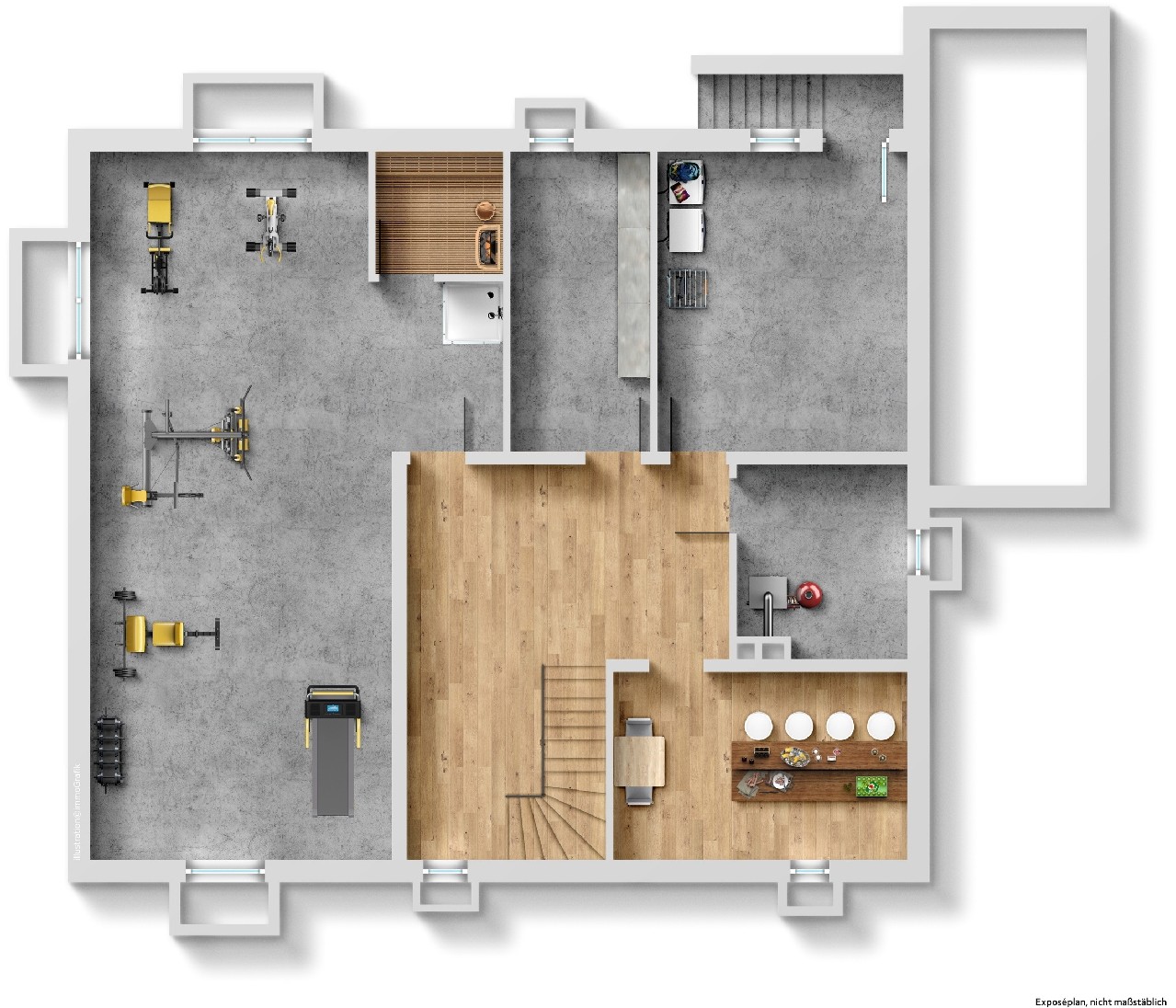 Im Kellergeschoss stehen Ihnen große Abstellflächen zur Verfügung sowie ein großzügiger Hobbyraum mit einer Dusche und Sauna.