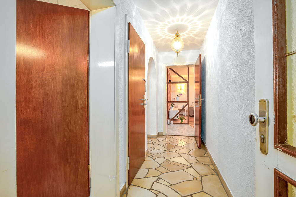 Über ein paar Stufen gelangen Sie zur Eingangstür, die durch das schützende Vordach bei jedem Wetter einen trockenen Zugang zum Haus bietet. Die Überdachung verleiht dem Eingangsbereich zusätzlich einen einladenden Charakter und bietet auch Raum für dekorative Elemente, um Gäste stilvoll zu empfangen.