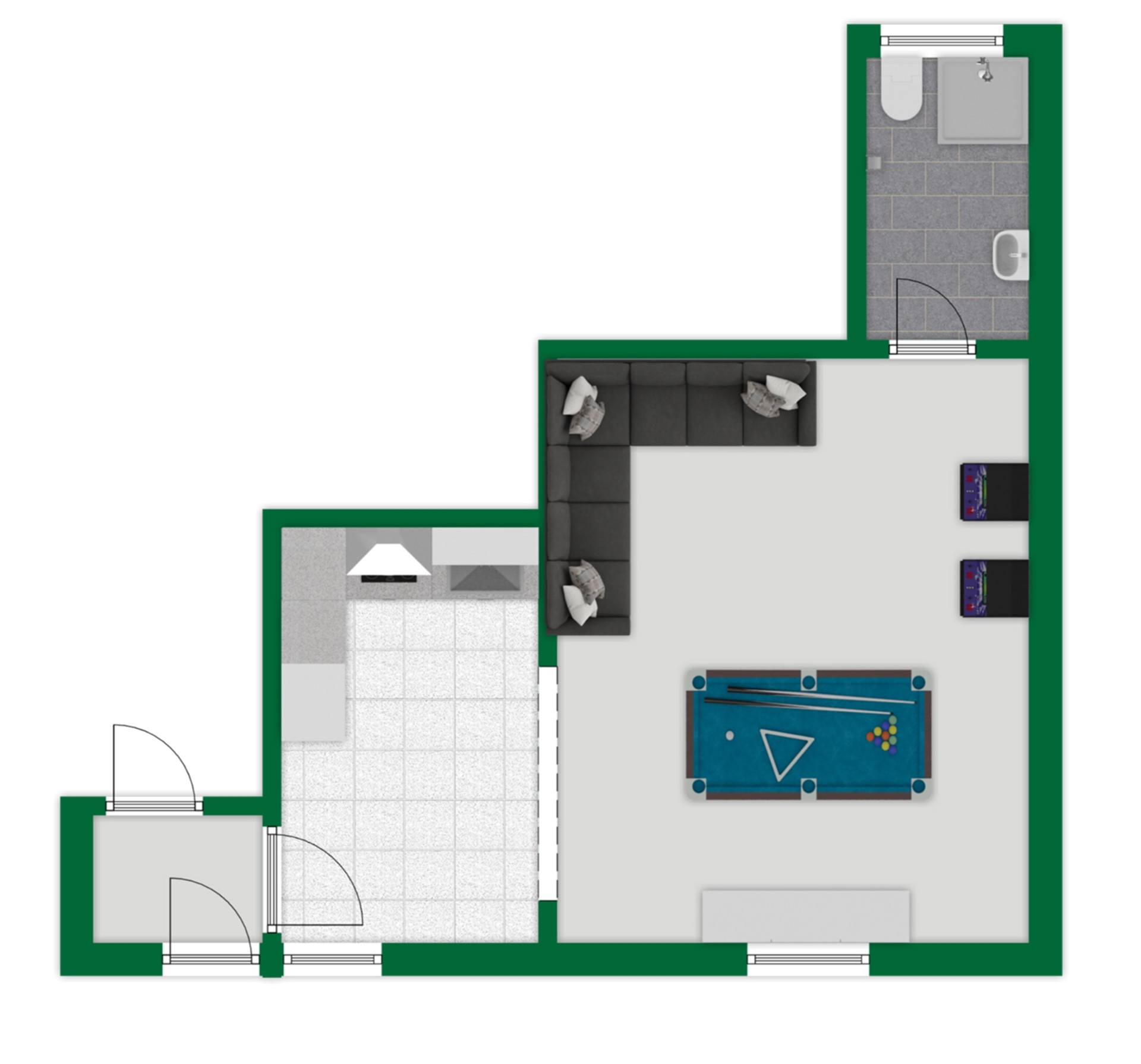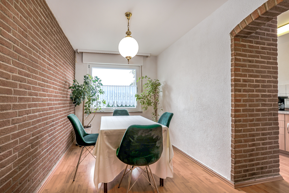Im Erdgeschoss erwartet Sie eine offene und gemütliche Raumaufteilung. Die Küche ist durch einen rustikalen Türbogen aus Backsteinen vom angrenzenden Esszimmer getrennt ist. Der charmante Backstein-Stil setzt sich an einer Wand des Esszimmers fort und verleiht dem Raum eine warme und behagliche Atmosphäre. Vom Esszimmer aus gelangen Sie durch einen weiteren offenen Bogen in das helle, großzügige Wohnzimmer. Hier haben Sie Zugang zu einem Balkon, der einen schönen Blick auf den Garten bietet und viel Tageslicht hereinlässt. Zusätzlich gibt es auf dieser Ebene ein weiß gefliestes Badezimmer sowie ein weiteres Zimmer, das flexibel als Schlafzimmer, Arbeitszimmer oder Gästezimmer genutzt werden kann.