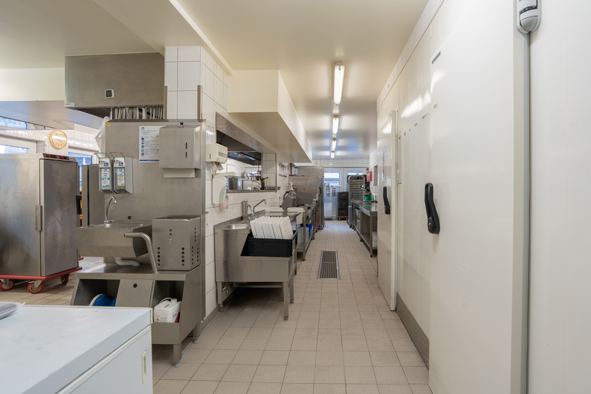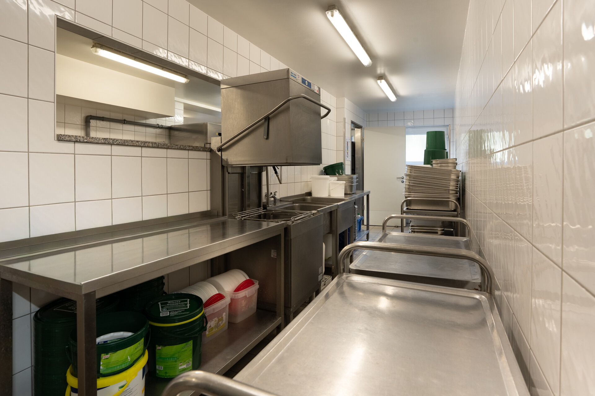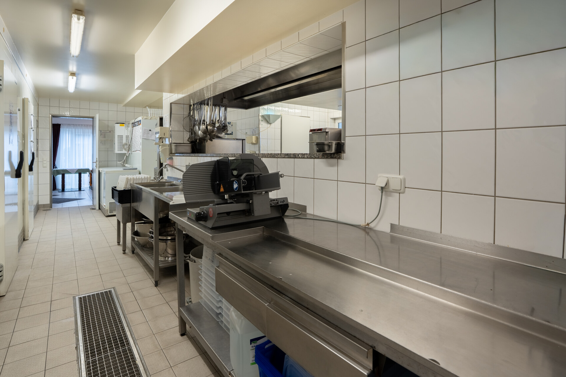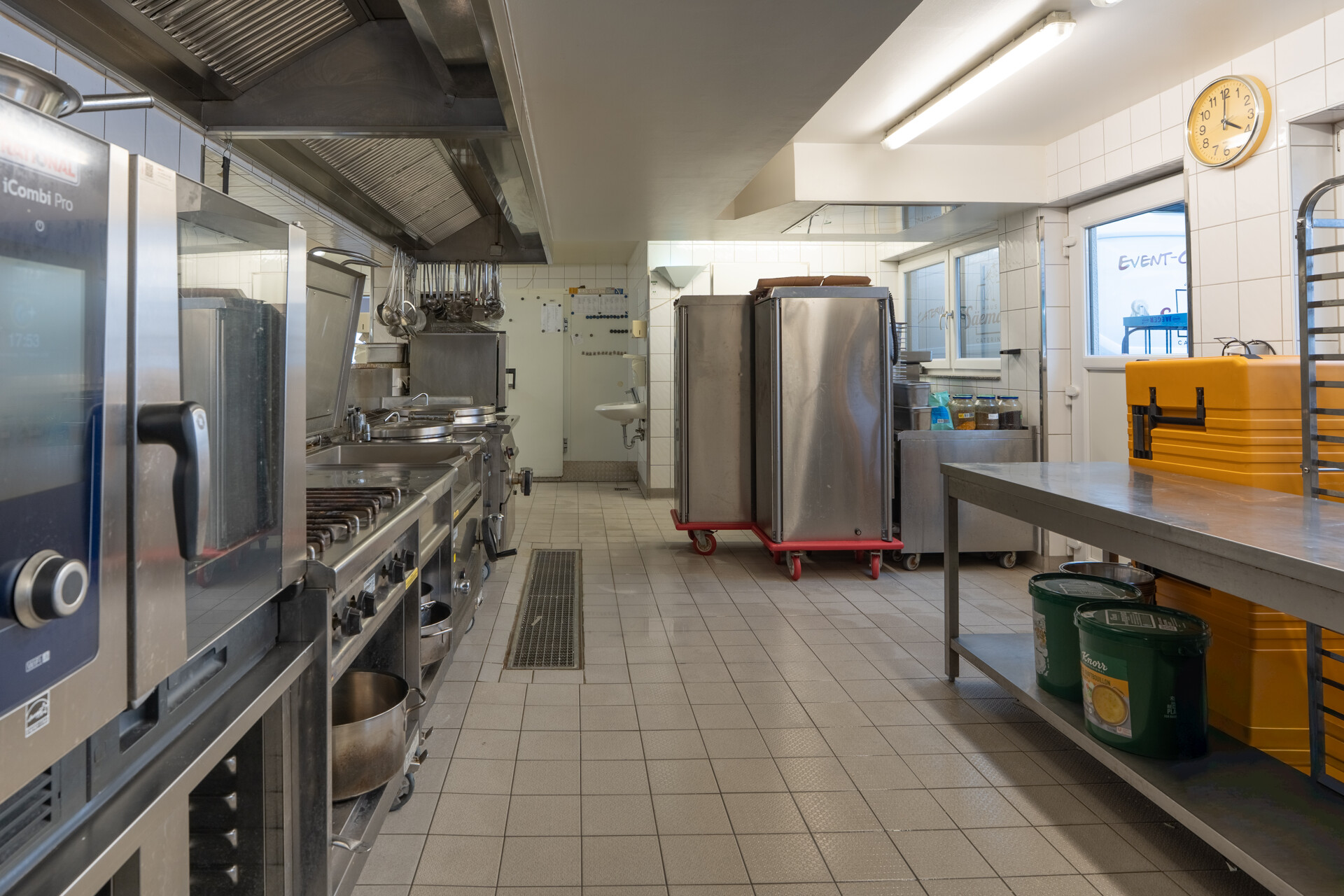 Der Hauptbereich umfasst eine weitläufige Produktionsküche, ausgestattet mit drei Kühlhäusern, einem separaten Tiefkühler sowie hochwertigen Rational iCombi Pro Geräten, einem Kipper und weiterer professioneller Küchentechnik. Eine besonders praktische Besonderheit ist die Spülküche, die auch von außen bestückt werden kann – ideal für reibungslose Abläufe bei hohem Produktionsvolumen. Zusätzlich steht ein Mitarbeiterbereich mit sanitären Anlagen sowie ein großzügiges Lager zur Verfügung. Für Veranstaltungen ist die Küche bestens vorbereitet: Geschirr für bis zu 400 Personen ist bereits vorhanden. Aktuell werden in dieser Küche täglich rund 1.200 Essen produziert – ein klarer Hinweis auf die Leistungsfähigkeit und professionelle Ausstattung des Standorts. Die Fläche wird zum 01.08.2026 frei und ist sofort betriebsbereit – ein perfekter Startpunkt für Caterer, Lieferdienste oder gastronomische Produktionsbetriebe, die ohne große Anfangsinvestitionen loslegen möchten. -