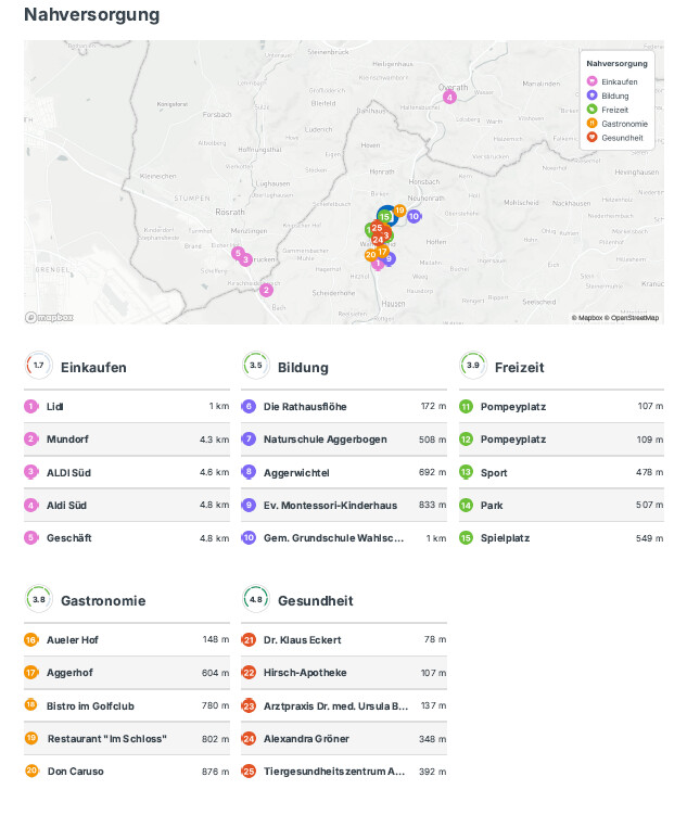 Die angebotene Gastronomieeinheit befindet sich in Lohmar-Wahlscheid, einem etablierten und gut erreichbaren Ortsteil im Rhein-Sieg-Kreis. Die Lage zeichnet sich durch eine gewachsene Umgebung mit Wohn- und Mischbebauung aus und bietet damit ein attraktives Einzugsgebiet sowohl aus der direkten Nachbarschaft als auch aus dem weiteren Umfeld. Dank der guten Anbindung an die regionalen Verkehrsachsen ist der Standort komfortabel erreichbar. Einkaufsmöglichkeiten für den täglichen Bedarf, weitere Dienstleistungsangebote sowie Einrichtungen des öffentlichen Lebens befinden sich in der näheren Umgebung. Die naturnahe Prägung der Region sowie die Nähe zu beliebten Freizeit- und Erholungsbereichen erhöhen zusätzlich die Aufenthaltsqualität und unterstützen eine nachhaltige Kundenfrequenz.