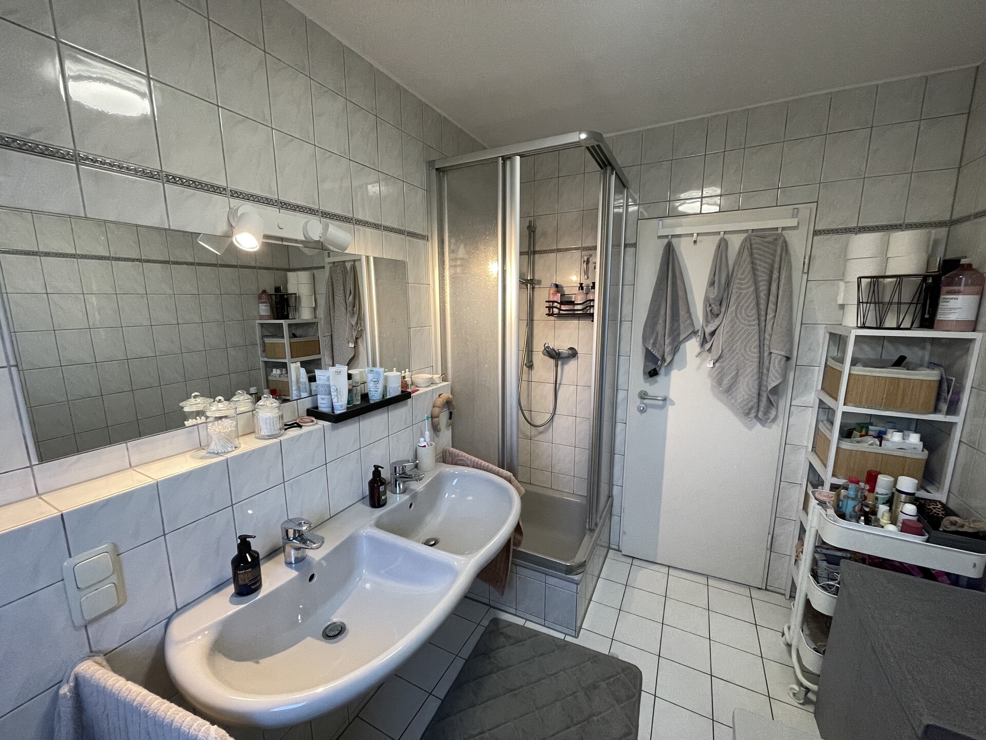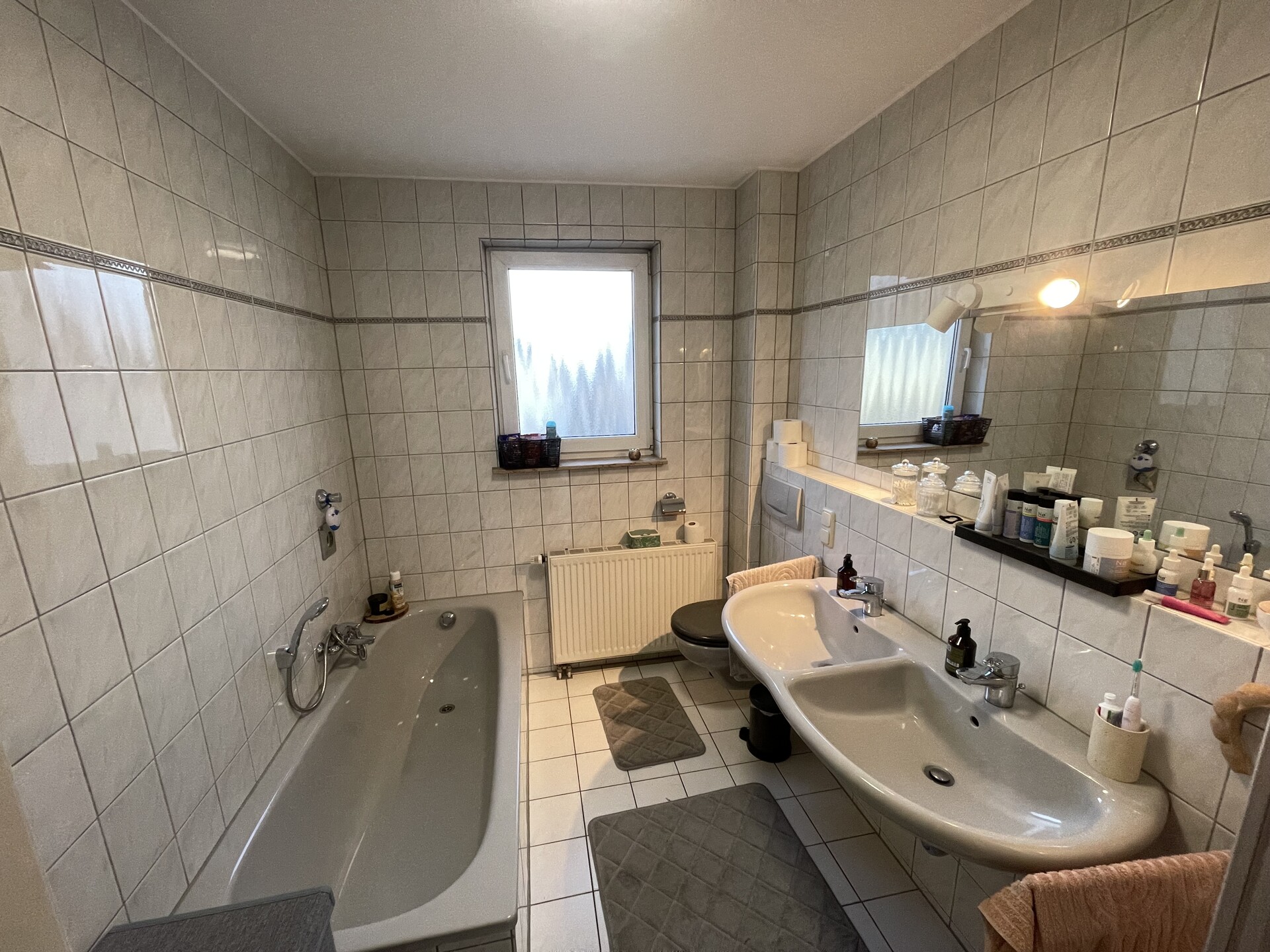 Das Tageslicht-Badezimmer ist mit Dusche, Badewanne und Doppelwaschtisch ausgestattet.
